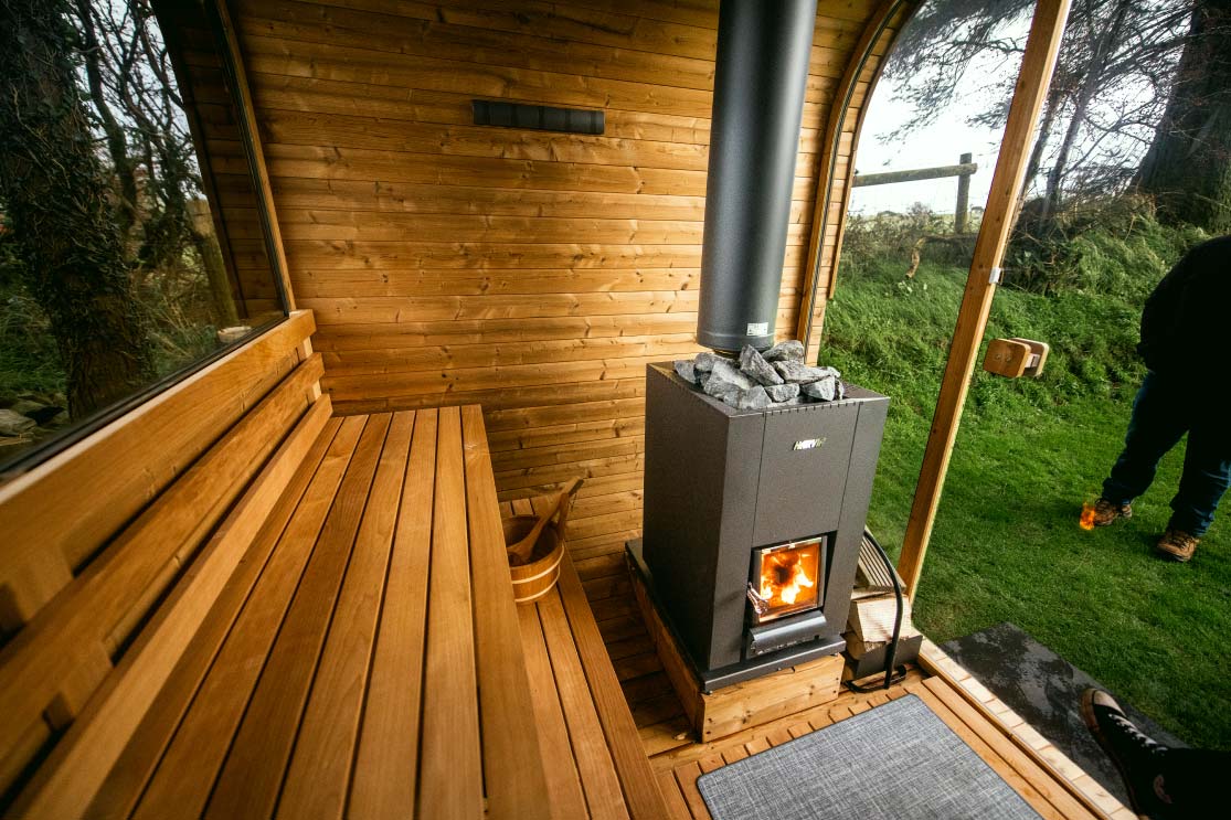 In a cube sauna, the heat is pushed back down the curved sides and into the sauna as new heat rises from the heater.