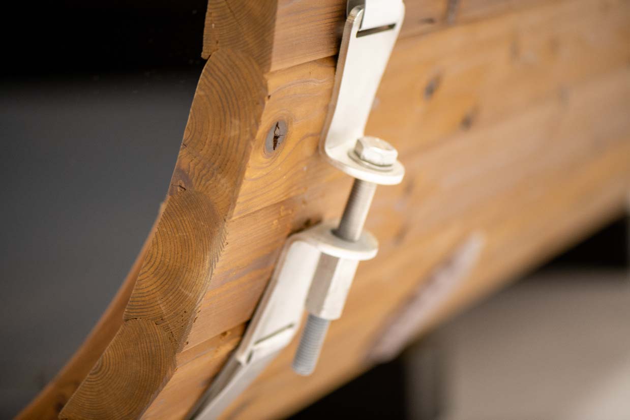 The ball-and-socket assembly of a cube sauna lets the wood expand and contract within the steel bands, creating a tight seal that won’t shatter.
