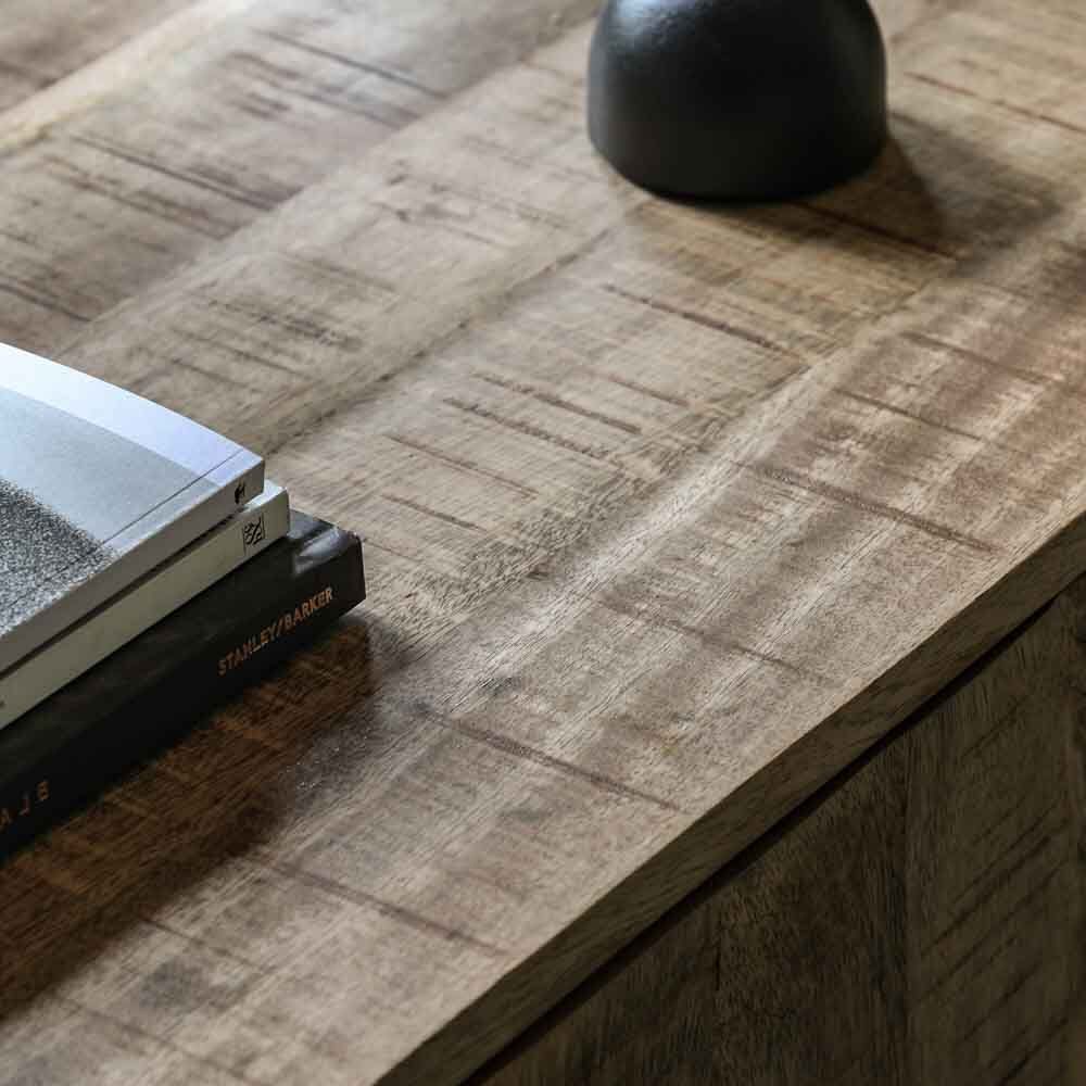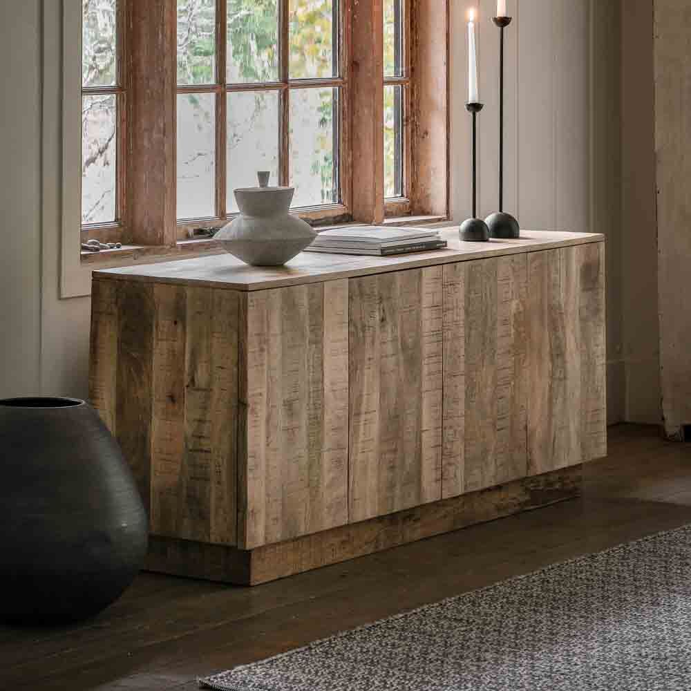 Add rustic charm to your home with this sturdy sideboard. With rough hewn Mango wood in a charming natural finish, this chunky sideboard features 4 doors with 2 cupboards and interior shelves, perfect for storage. Also available in a whitwash finish. Coordinating additional pieces available.