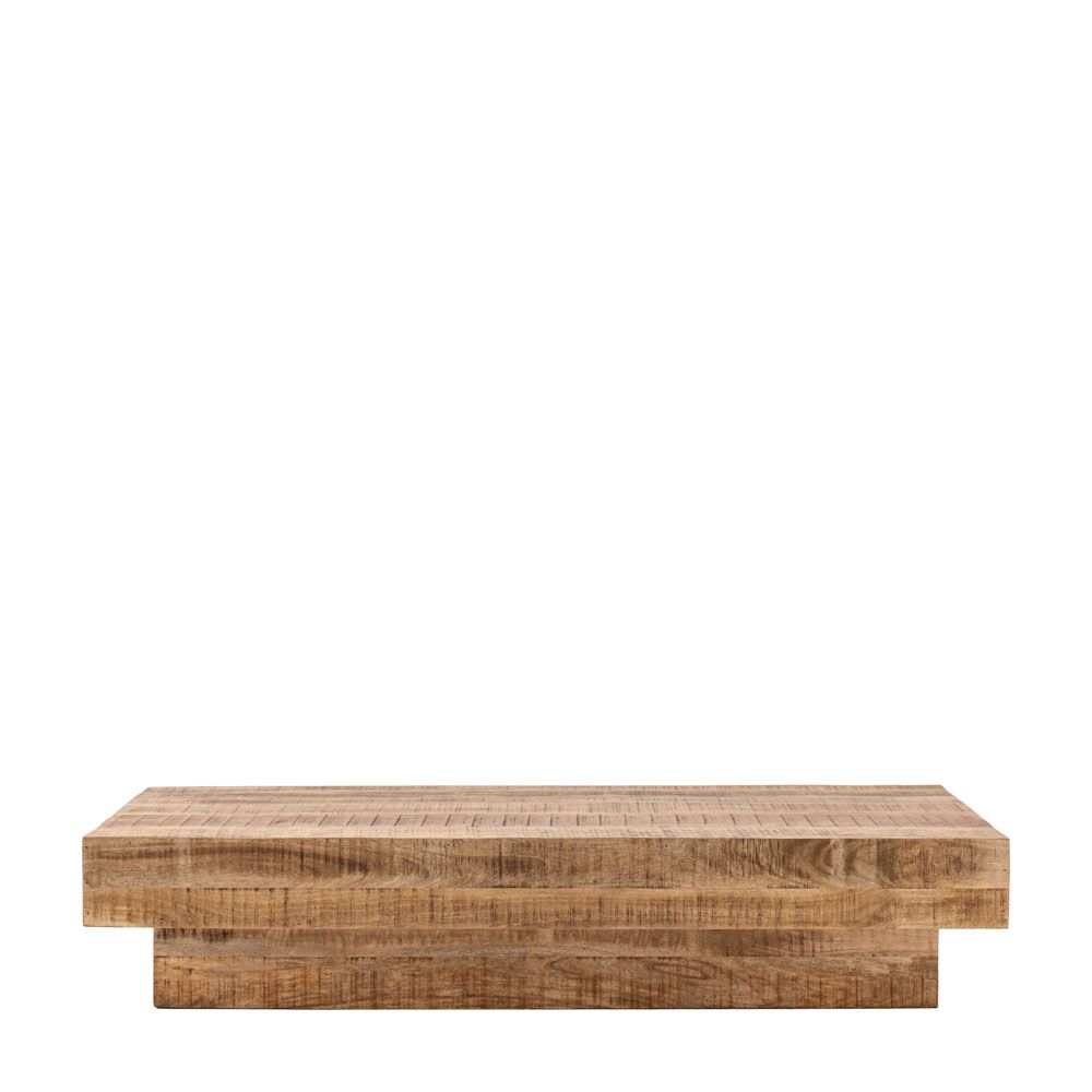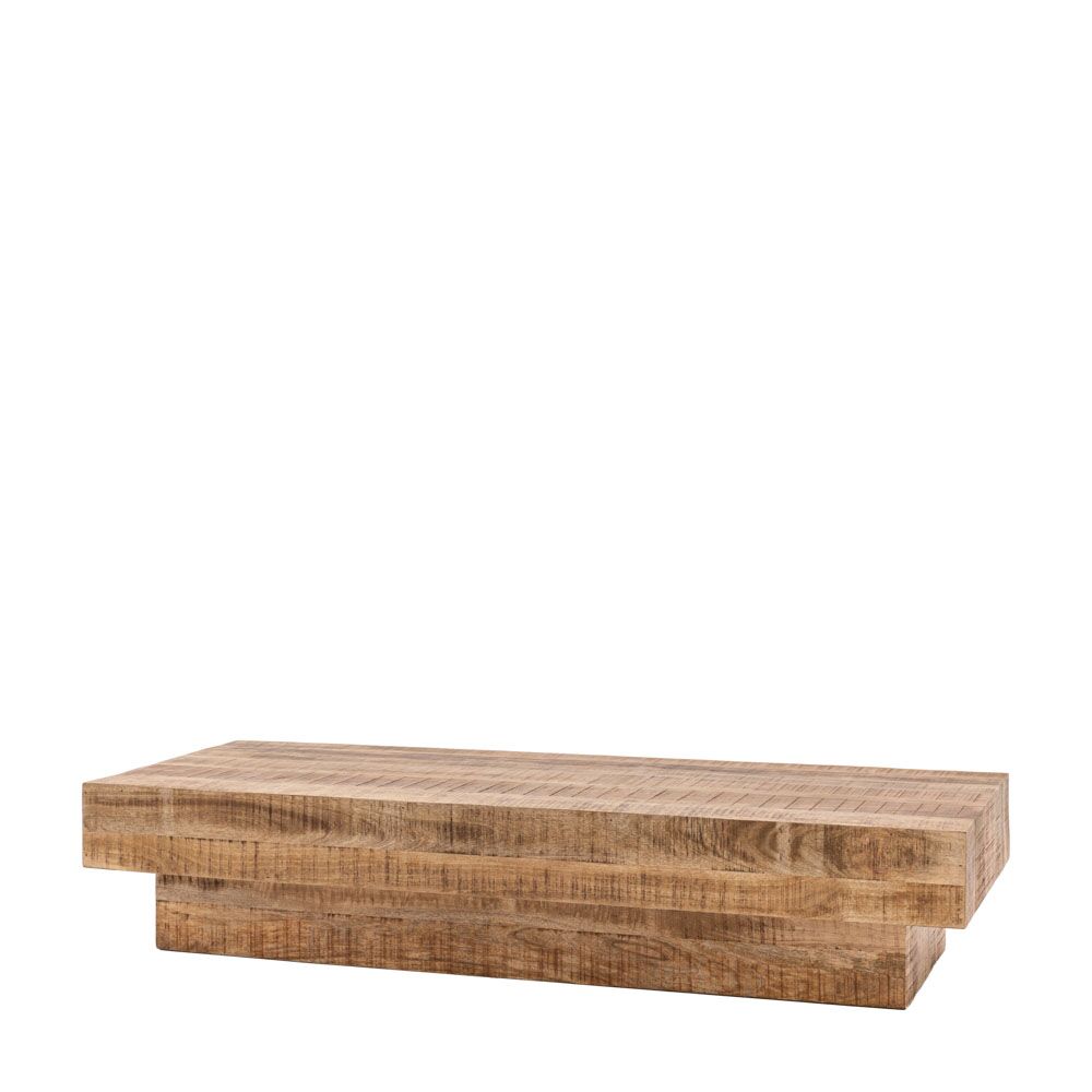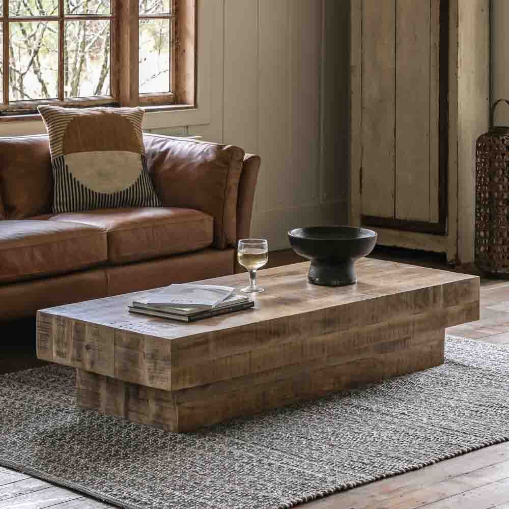 Add a contemporary rustic touch to a room with this coffee table. The piece is cleverly designed to look like solid blocks of cross-sawn timber, but is actually produced using architectural veneers for stability and practicality. The dry weathered finish enhances the design.