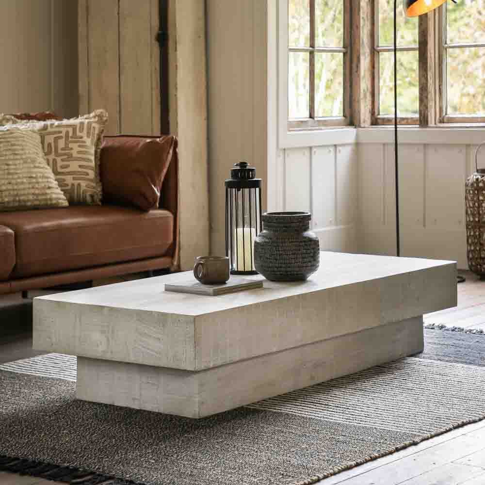 Full of rustic charm this sturdy coffee table is designed to show off the lovely rough hewn whitewashed Mango wood to its best. The chunky stepped design will fit right into any homely interior. Also available in a natural finish. Coordinating additional pieces available.