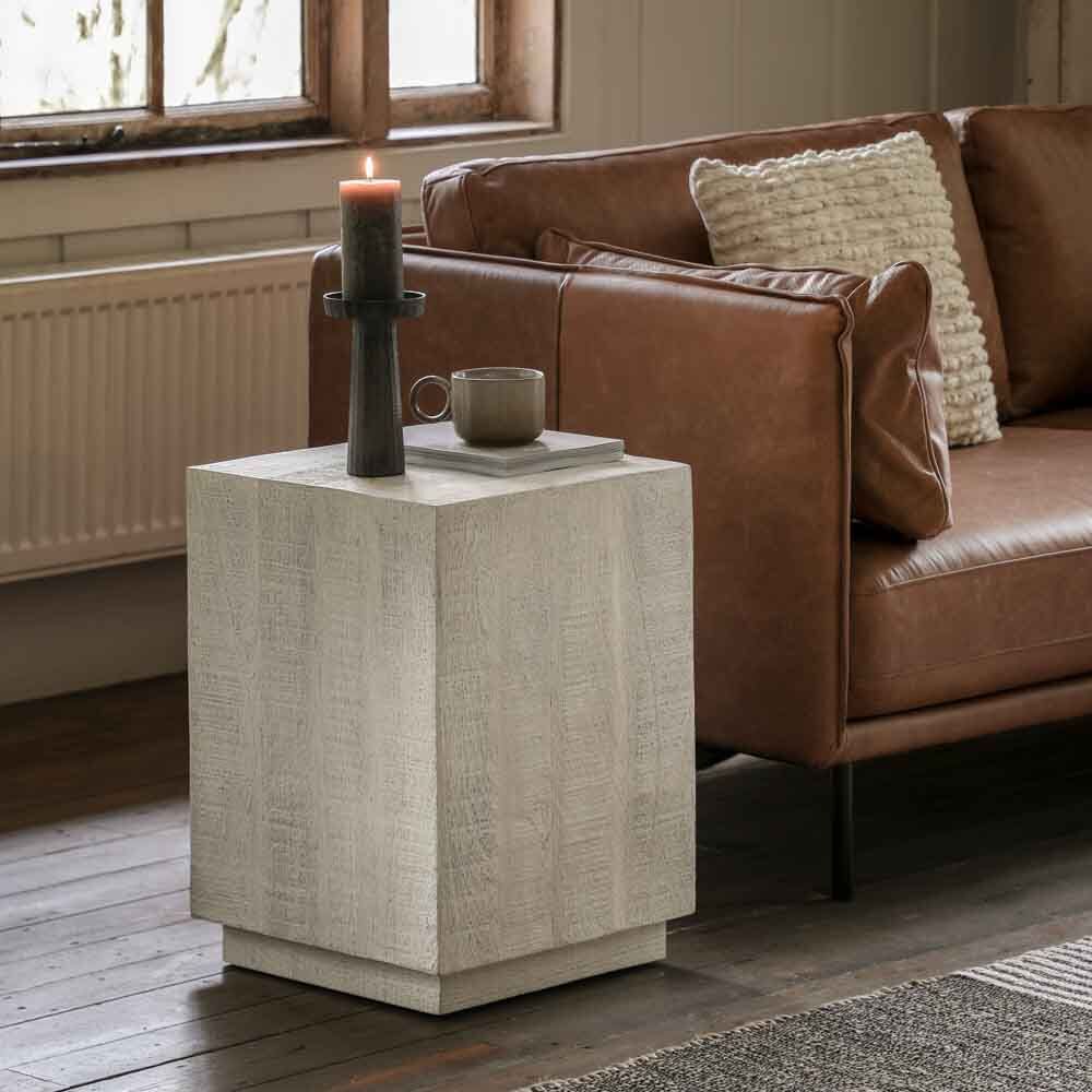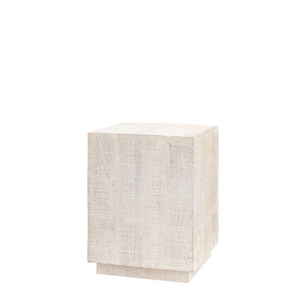 Rusticaly charming this chunky side table is designed to let the rough hewn whitewashed Mango wood speak for itself. The stepped blocky shape of this table shows off the wood to its best and creates a table perfect for any modern rustic home interior. Also available in a natural finish. Coordinating additional pieces available.