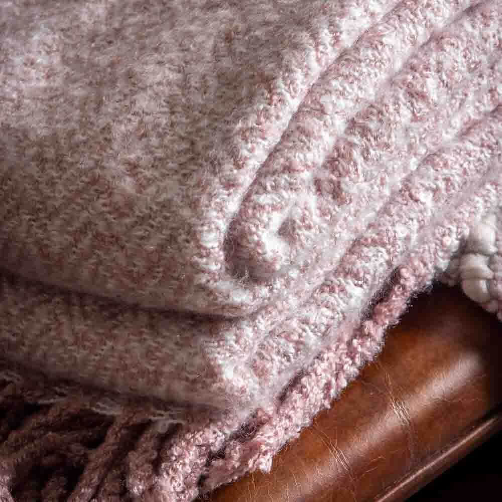 Beautifully soft mohair feel throw with two tone herringbone pattern and solid fringing detail.