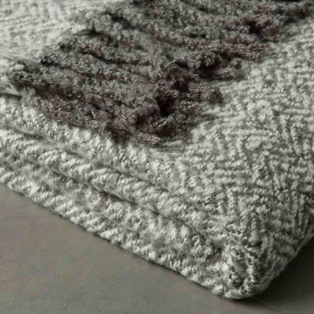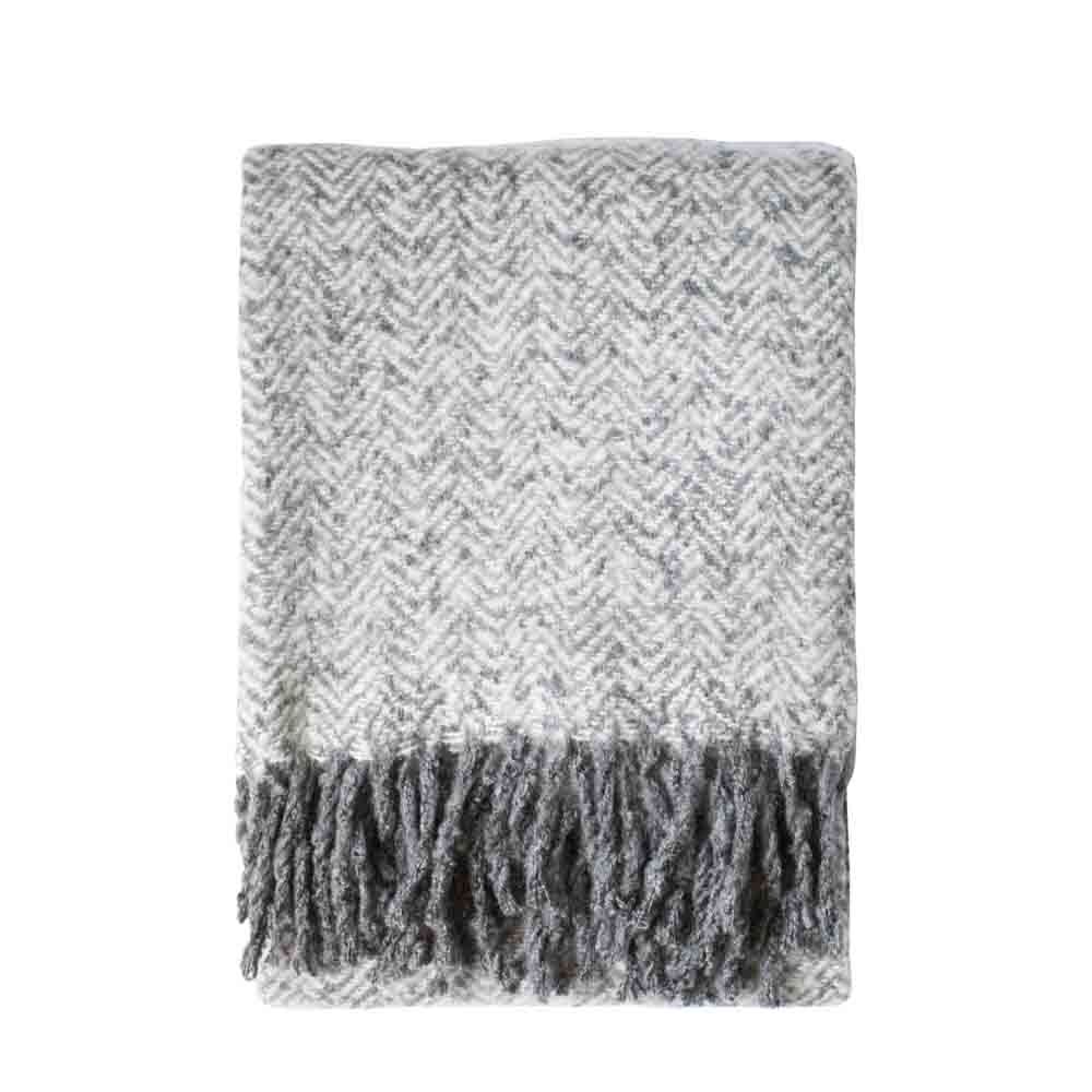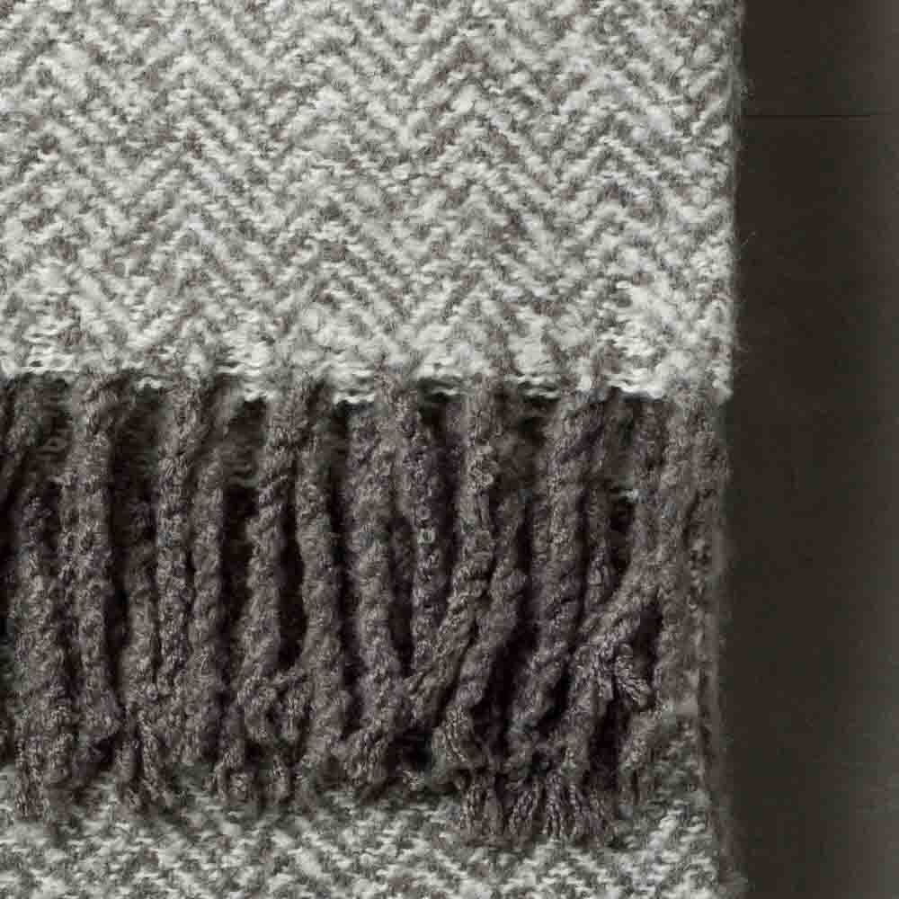 Beautifully soft mohair feel throw with two tone herringbone pattern and solid fringing detail.