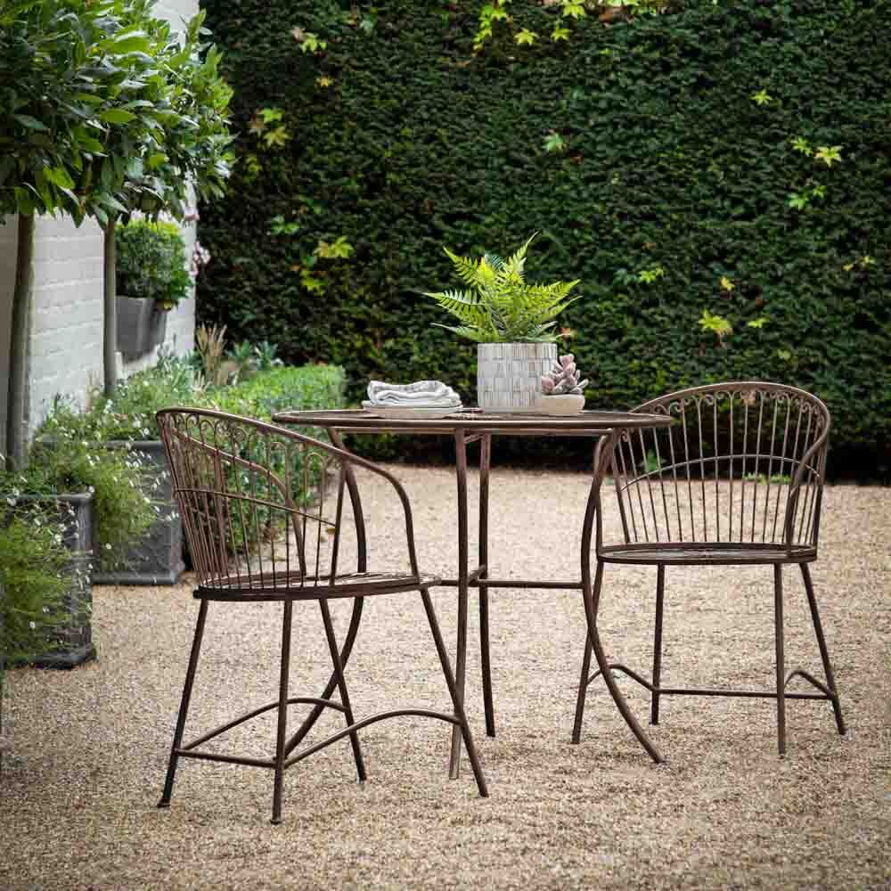 Offering a more unusual take on traditional bistro café style, this set features a flowing design which is echoed in the round seats and lovely curved backs of the chairs. Crafted from metal, it has a lovely distress soft white finish. It is also available in a metal patina finish. Sold separately, we also offer round seat pads, designed to work perfectly with these chairs, to add comfort so you can relax for longer.