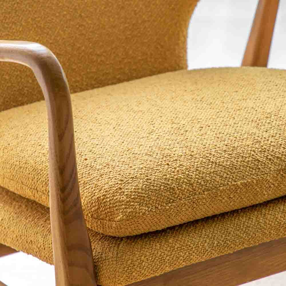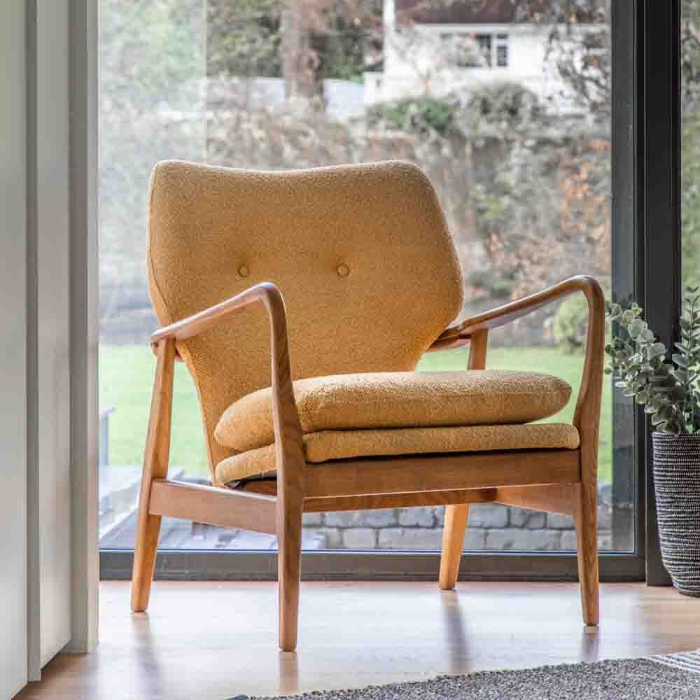 This remarkable Mid-Century style chair features an elegantly shaped solid oak wood frame which makes it a stand out piece in any interior. It is upholstered in ochre boucl? style fabric with button details and a soft cushion for comfort.