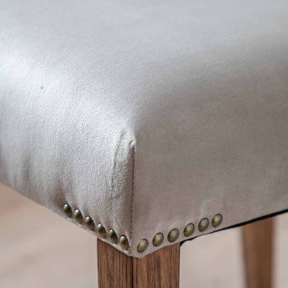 Set of 2 dining chairs perfectly suited to both modern and traditional interiors. The seat and back are upholstered in a luxurious taupe velvet, with metal detailing, which pairs perfectly with the rich tonal Mindy wood finish legs.