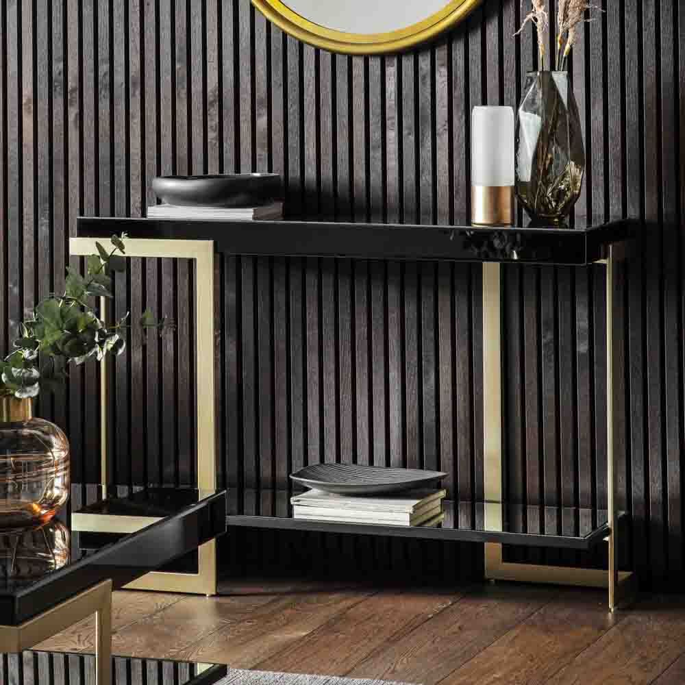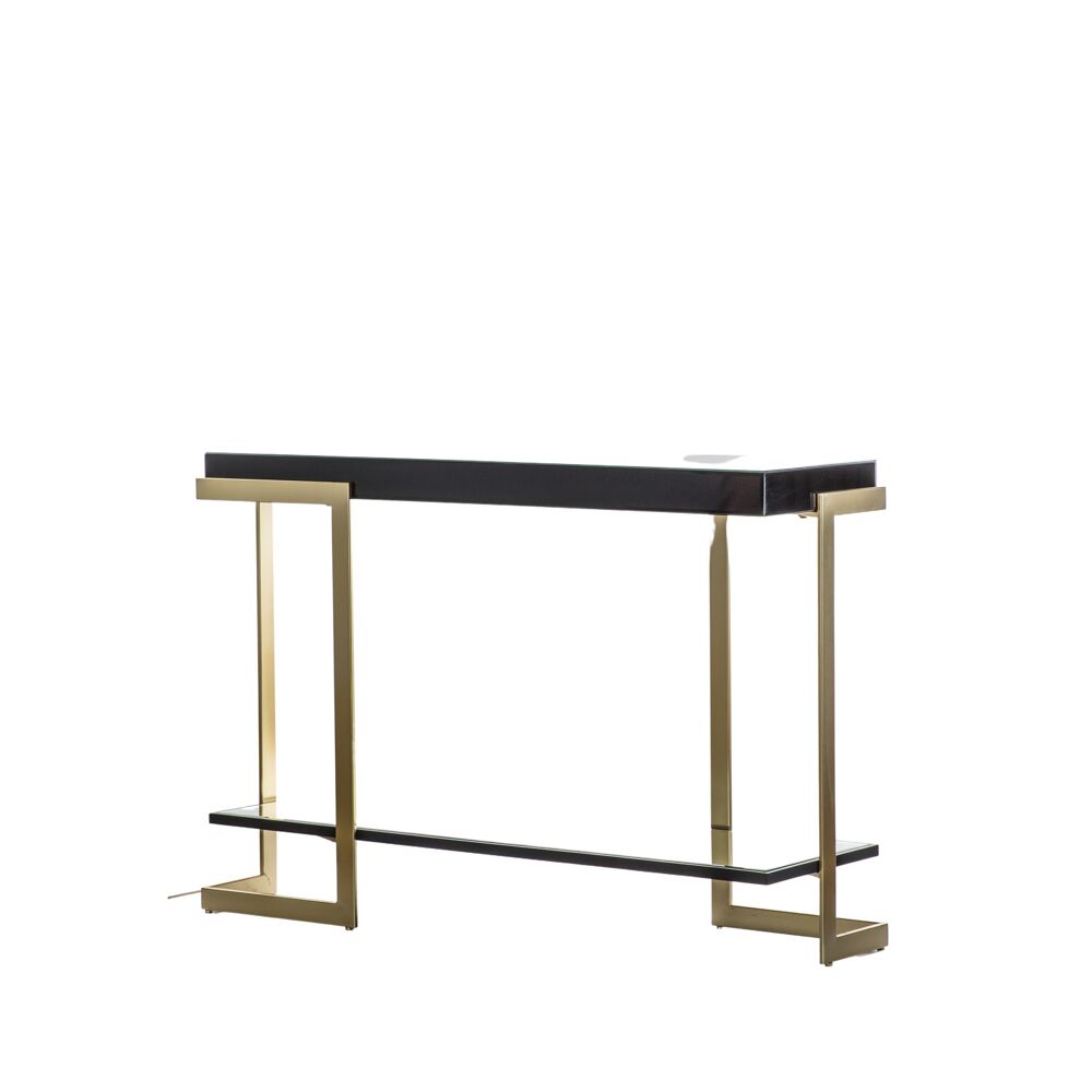 Glamorous and sophisticated, this high design coffee table combines a bold metal base in a soft gold finish with black glass tops and shelves for the ultimate in Luxe living. For even more glamour, pair with the coordinating side and coffee tables.