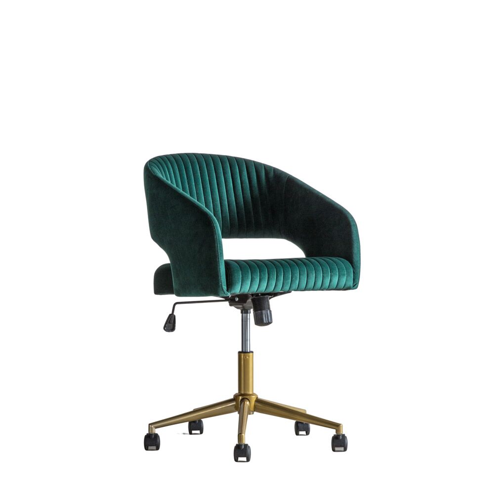 This sophisticated swivel chair adds a touch of glamour to a home office. The rich green velvet looks stunning with the gold base. Stitch detailing up the padded back and on the seat, tilt adjustment, gas lift seat height adjustment and castors for manoeuvrability combine to give a chair which is as comfy and practical as it is stylish. Also available in four other colours.