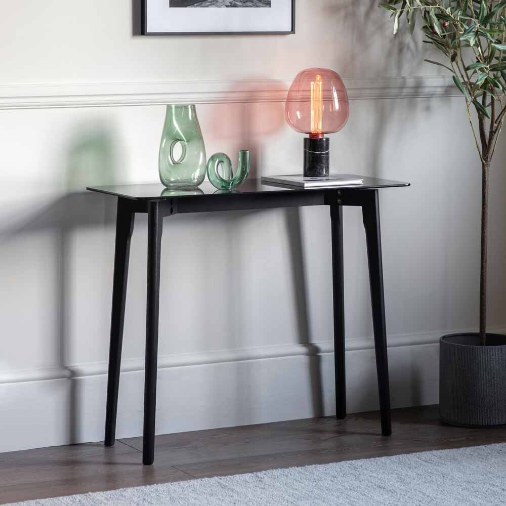 This lovely console table features a beautifully designed solid oak base with a black finish combined with a smoked tempered glass top to give a stunning contemporary look. It is part of a collection offering a range of tables, in the black oak and smoked glass, and also with natural oak bases paired with clear glass.