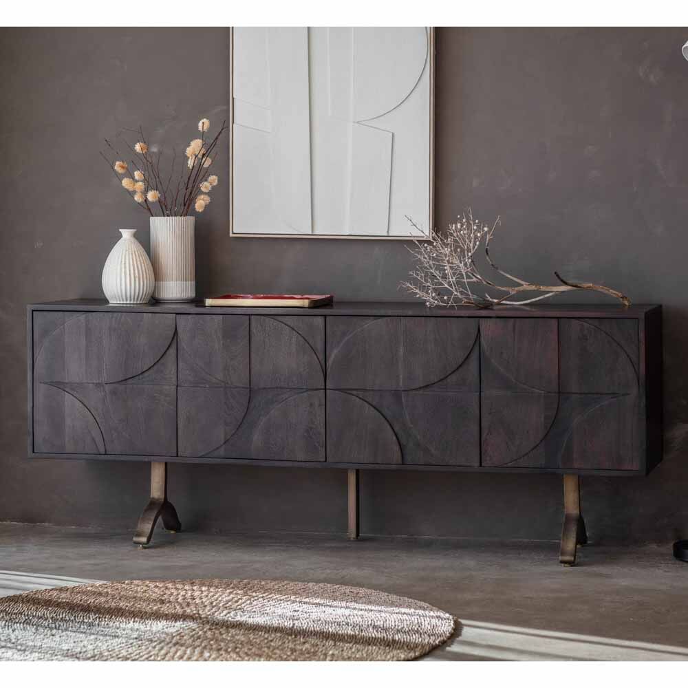 Unusual, eye-catching sideboard crafted from solid mango wood, with a stained finish to show the grain of the wood but with a slightly charcoal grey tone. The doors feature a geometric relief pattern with a Bauhaus influence, with the unusual shape of the legs adding the finishing design detail. The doors have push-catch opening. Inside the sideboard are two cupboards, each with an adjustable shelf and a cable hole for added practicality.