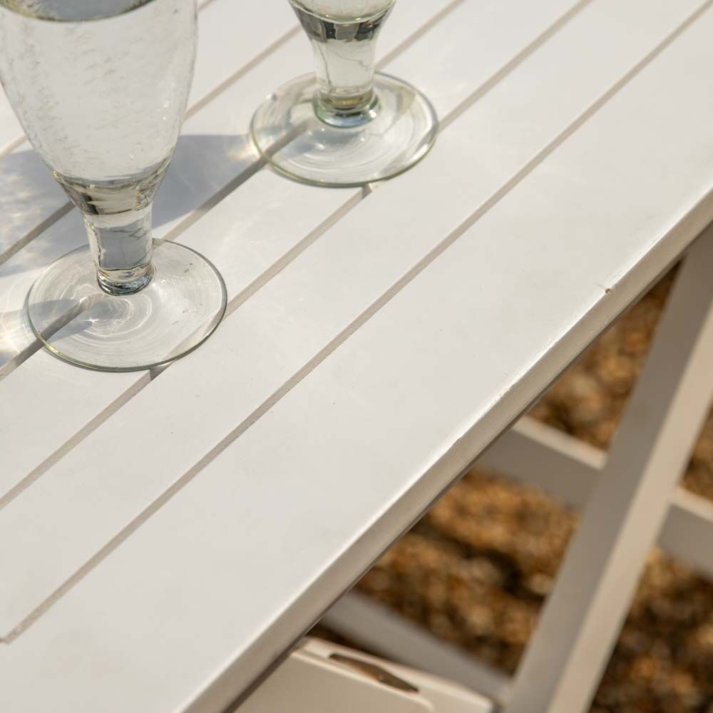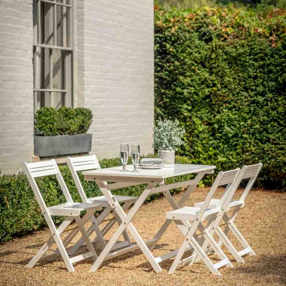Combining practicality and style this dining set folds away for easy storage or transportation. This elegantly simple white dining set comes complete with the folding slatted top dining table and folding 4 chairs.