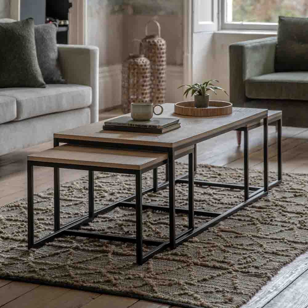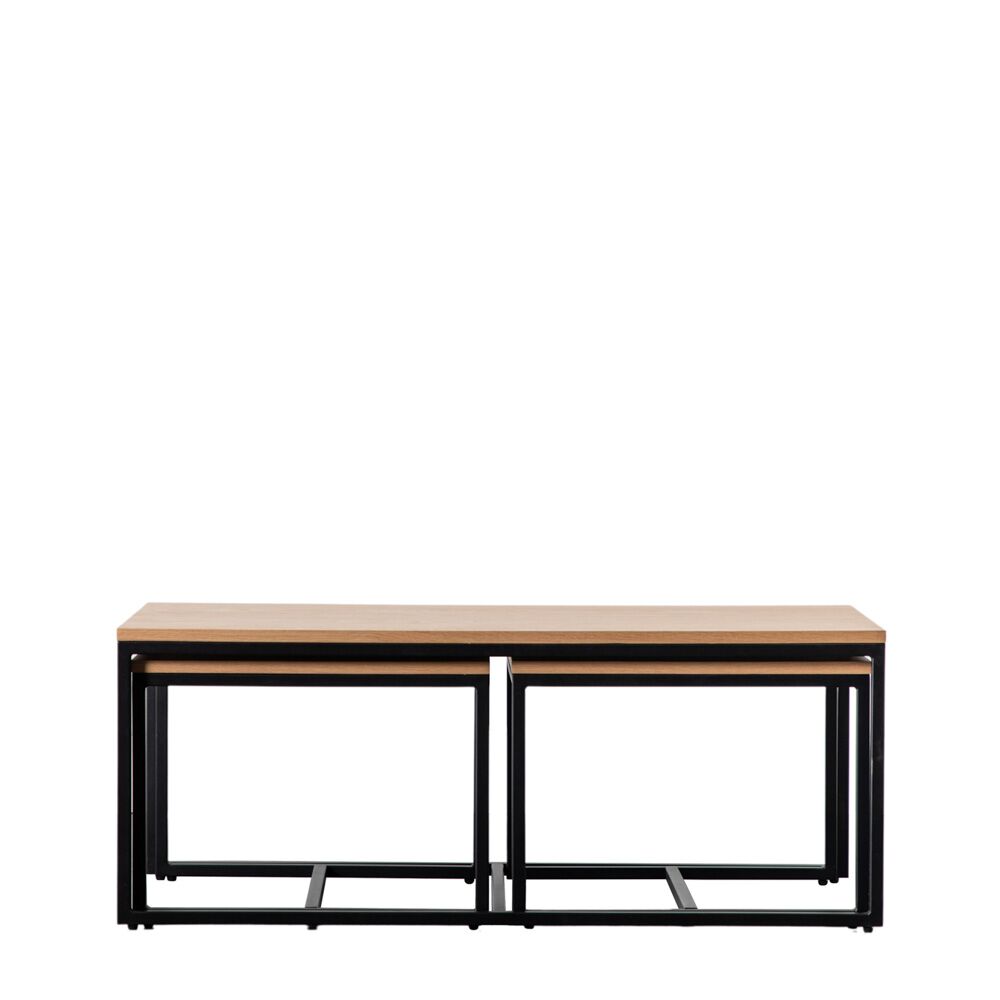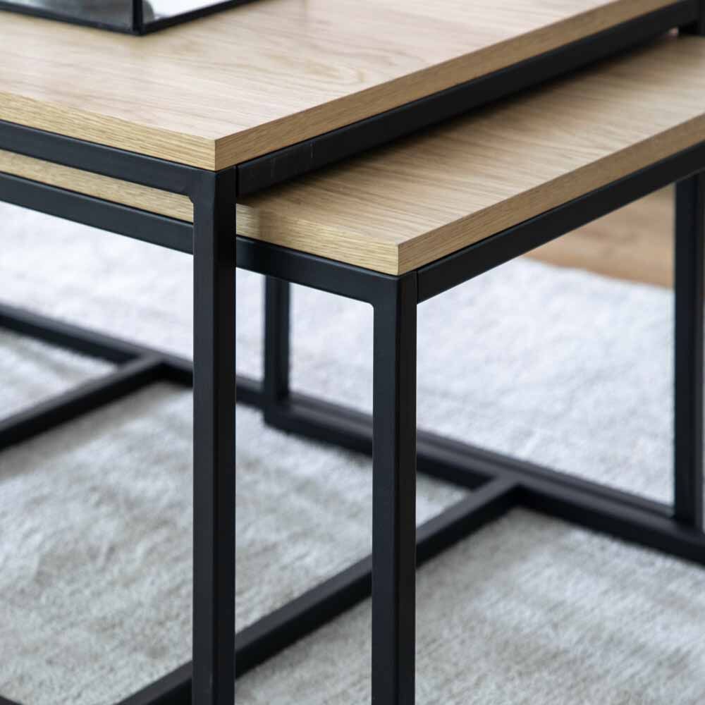 This stunning nest of tables combines clean sharp lines with natural oak veneer tops and matt black metal bases to offer crisp contemporary style. It features a larger table and two smaller ones which fit underneath when not in use. It is part of a collection which offers a range of tables plus a display unit.