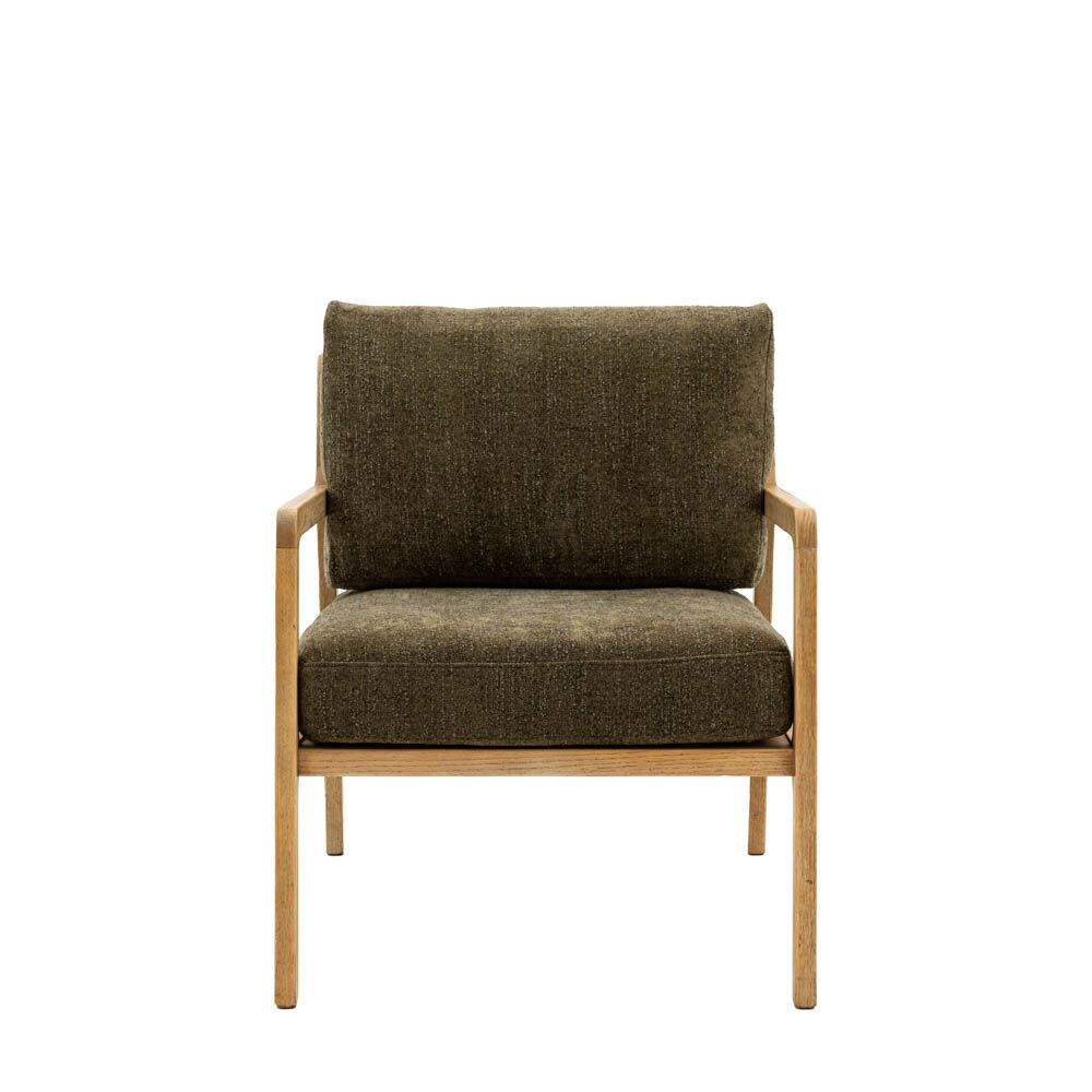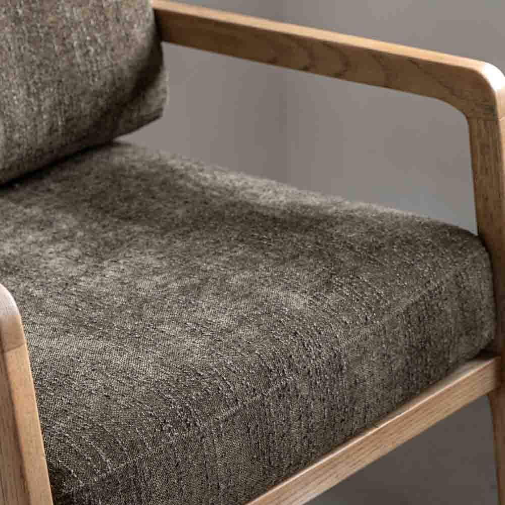 This stylish occasional chair offers a touch of retro design and would look at home in a wide range of interiors. The seat and back cushions are upholstered in lovely moss green fabric, which pairs beautifully with the wooden frame.