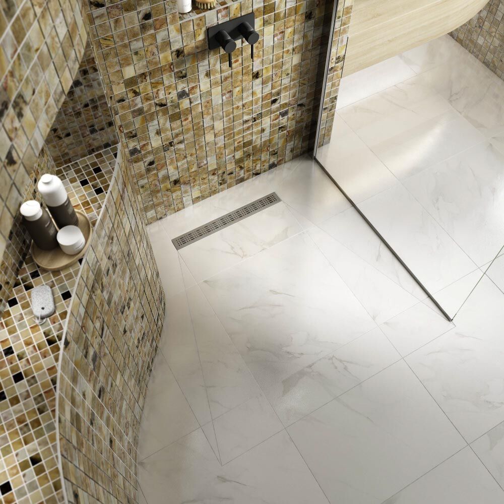 The 40mm thick version has a stylish brushed stainless steel linear channel drain. The 20/24mm thick version has a square brushed stainless steel drain in various locations.