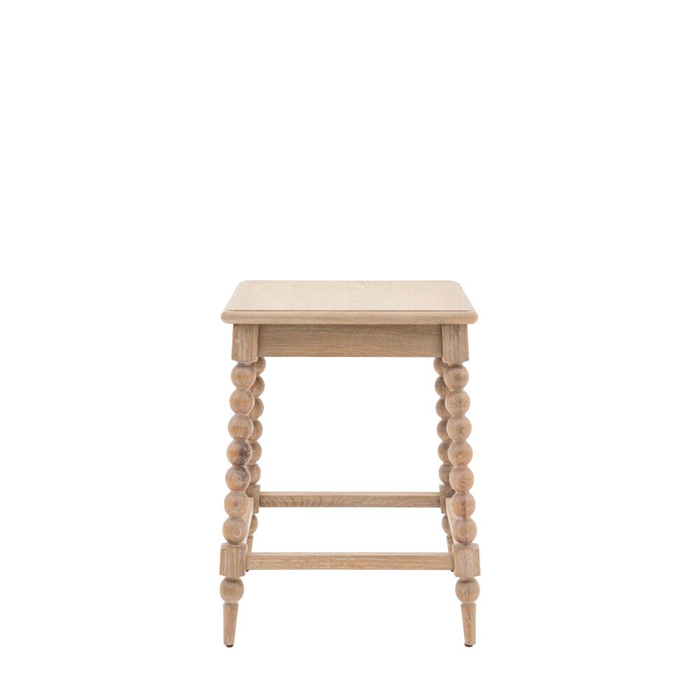 This stunning side table would make a stylish, classy addition to any interior. The play on a classic look emphasises the hand-crafted bobbing detail down each leg. This eye-catching design feature is created by turning the wood on a lathe, a task carried out by the finest craftsmen. The table is made using beautiful oak solids and veneers where practical, with a very subtle lime wash tone to the finish which is soft and mellow. Matching pieces are available.