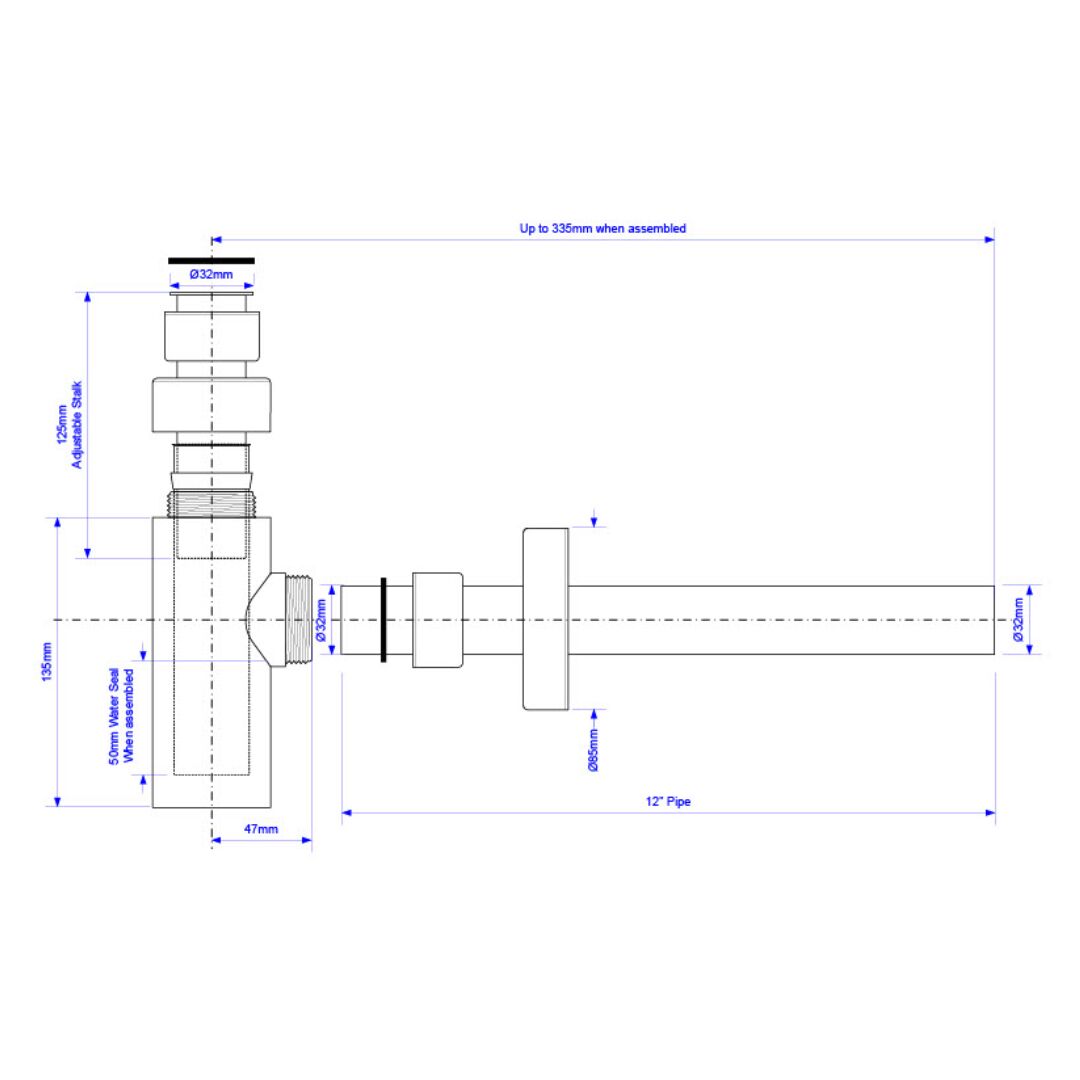 50mm Water Seal Chrome Plated Brass Adjustable Inlet Cylindrical Bottle Trap with 12? length of 32mm ? Outside Diameter Chrome Plated Brass Waste Pipe and Wall Flange