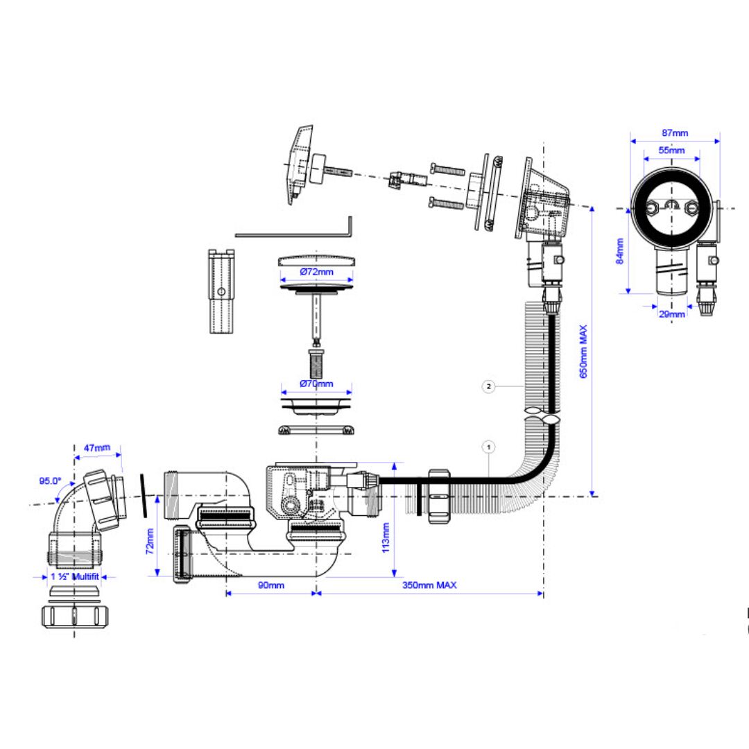 11/2? x 70mm Polished Stainless Steel Flange Pop-Up Bath Waste and Overflow ? Centre Pin Model with Overflow/Command Knob, Centre pin dry fixing connection has the advantage of a quick, simple and neat installation