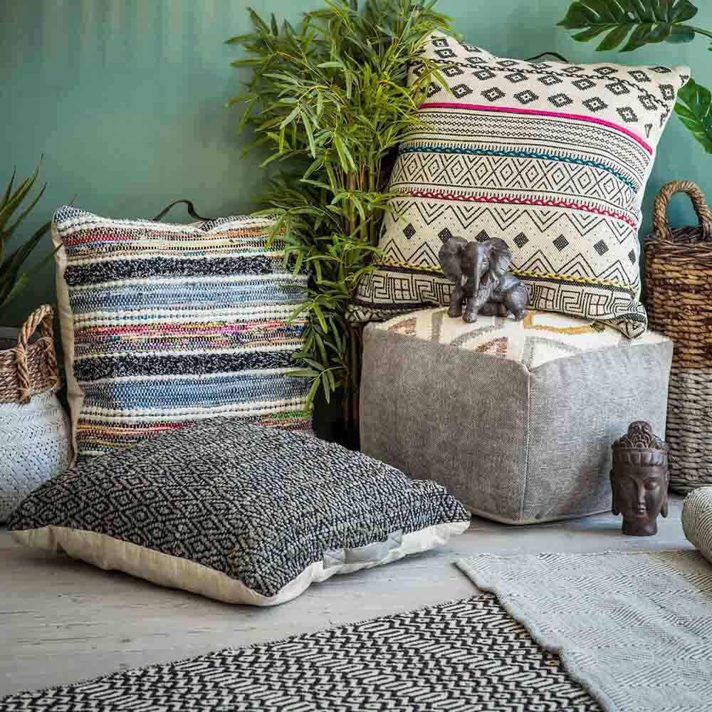 This square pouffe features a geometric top with a natural base and ochre detailing with simple grey sides and is filled with F.R polystyrene balls.