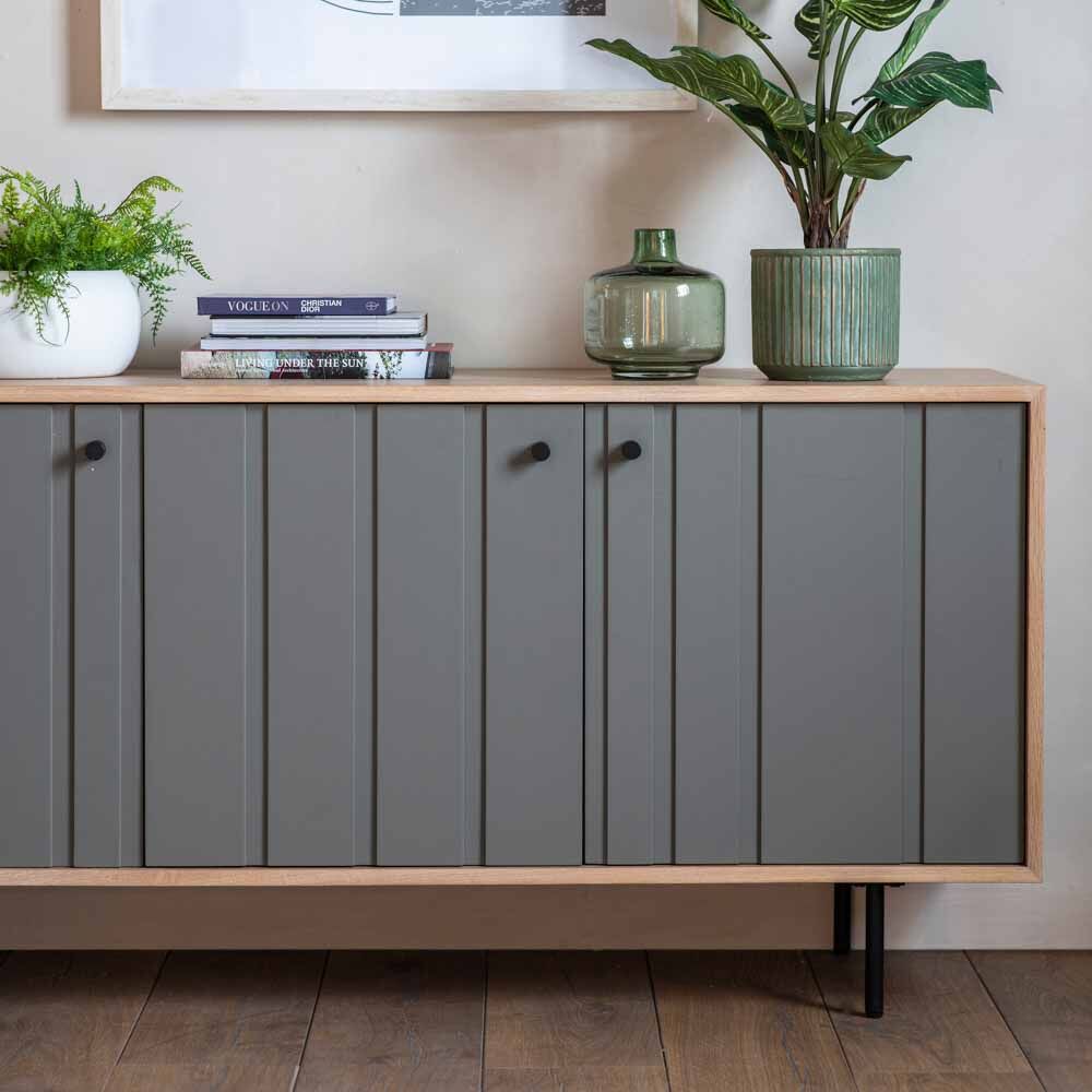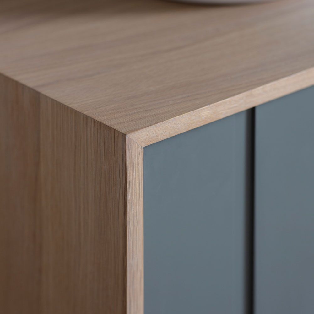 A contemporary furniture collection featuring a fusion of Japanese minimalism and Scandi style, creating these beautiful modern Japandi design pieces. Natural oak has been paired with mid-grey painted, with routing to create a relief design adding detail to the doors.