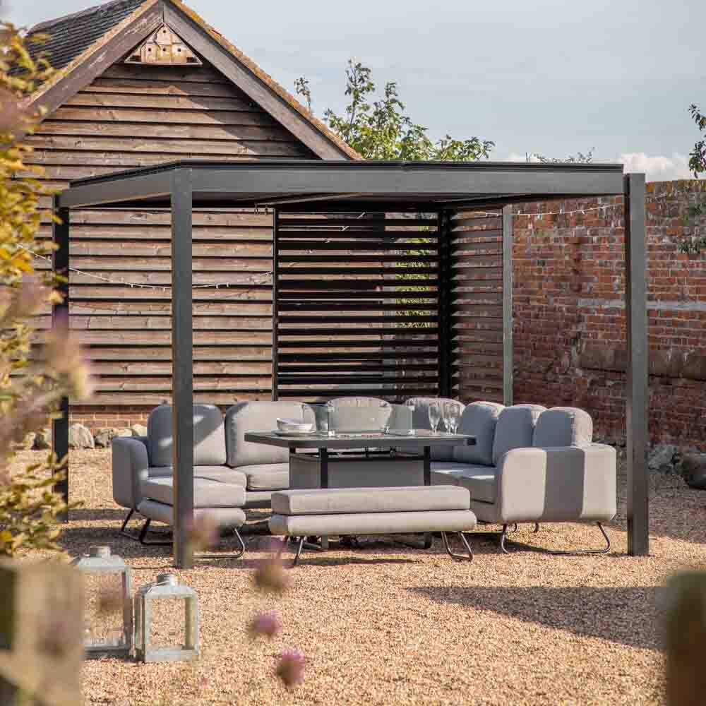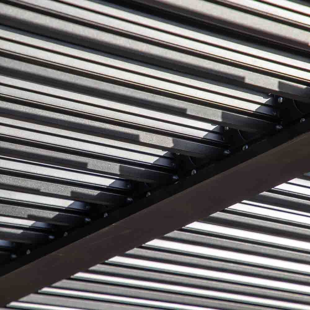 This stunning, high quality pergola is designed to allow you to enjoy your outdoor space for longer. The roof louvres can be tilted, using a handle winder, allowing you to let in the sunshine, or closing them to offer shade and cover from rain. The clever design features a drainage system; the louvres overlap when closed, making the roof watertight, and they incorporate drainage, so water runs from them into the frame and then down the inside of the legs. Slatted side screens in two sizes are available separately to accompany the pergola, with different options for position, allowing you to place them to suit your own design. To make a complete side, three of the larger screens are needed for the 4m side and three of the smaller screens for the 3m side. The pergola and screens are crafted from aluminium with a contemporary black powder coated finish.