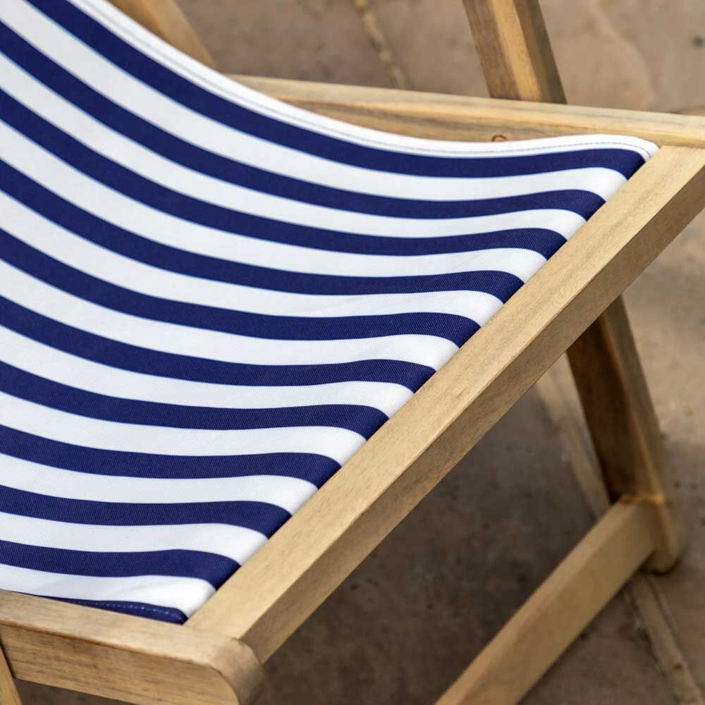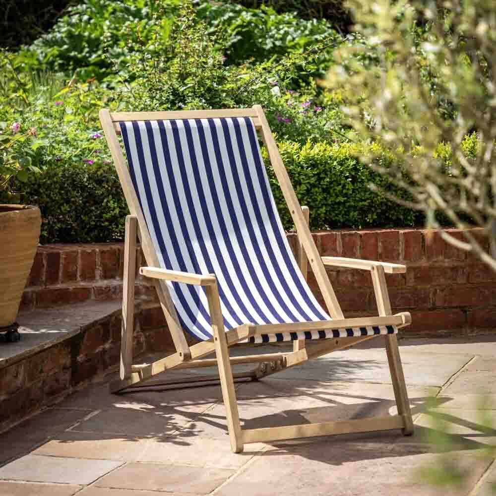 Sit back and make the most of the summer sunshine with a classic blue stripe deckchair. Adjustable to 3 positions and featuring armrests for extra comfort this is the perfect chair for some summer lounging. Folds away for easy storage.