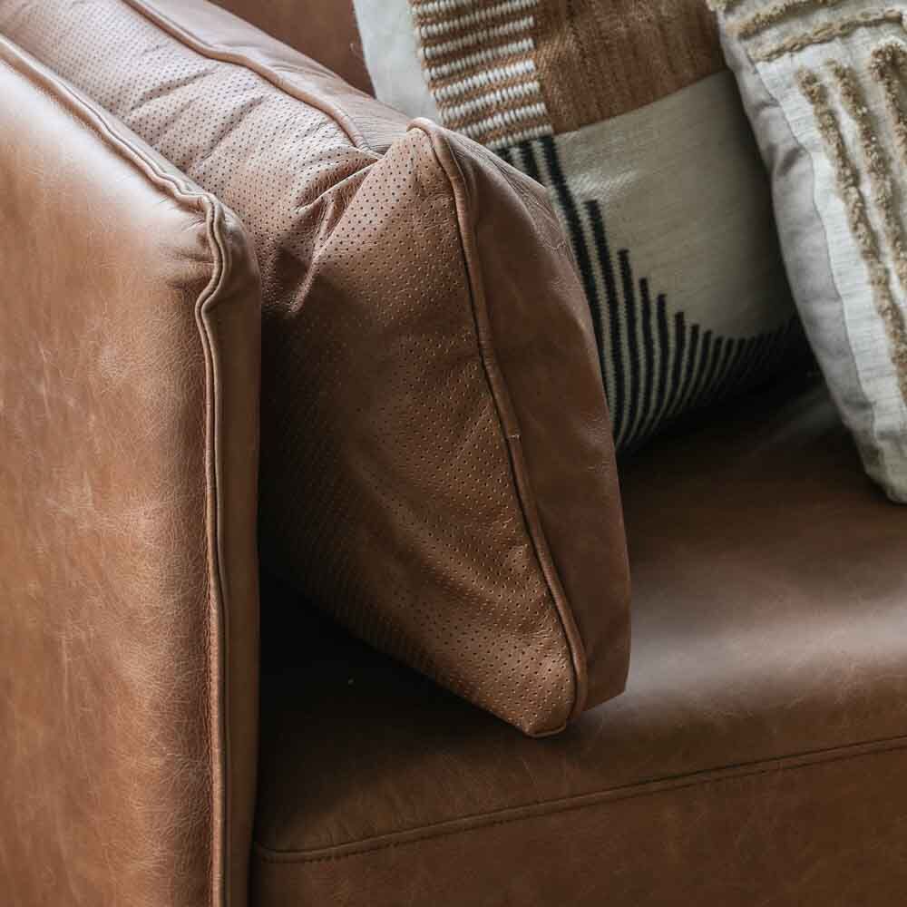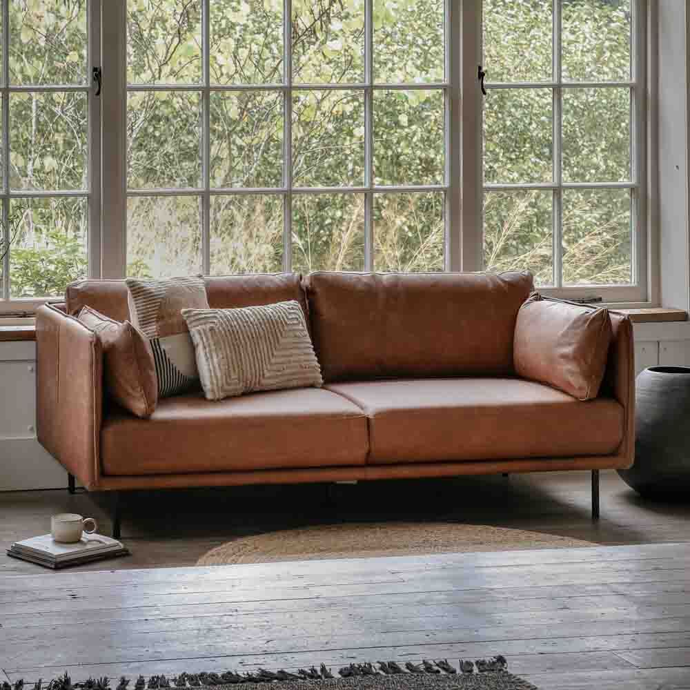 Offering a sleek contemporary look, this stylish sofa is fully upholstered in a lovely warm brown leather, with black metal legs perfectly complementing the design. The slim arms feature stitch seam detailing which is echoed on the side cushions.