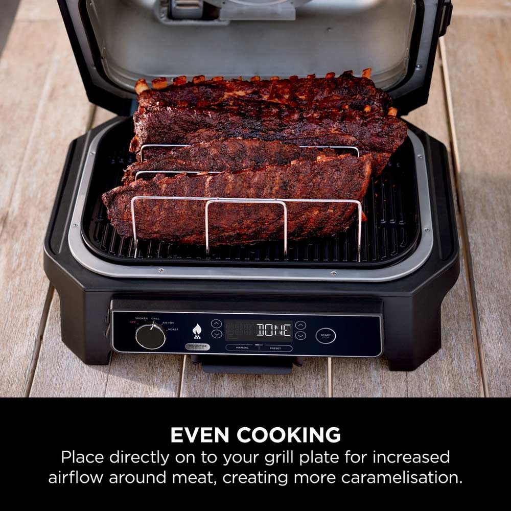 Cook up to 4 full racks of deliciously tender ribs with authentic smoky flavours, using this handy accessory for your Ninja Woodfire XL BBQ Grill, allowing airflow all around the meat for even cooking. Easy to wipe clean after every use.