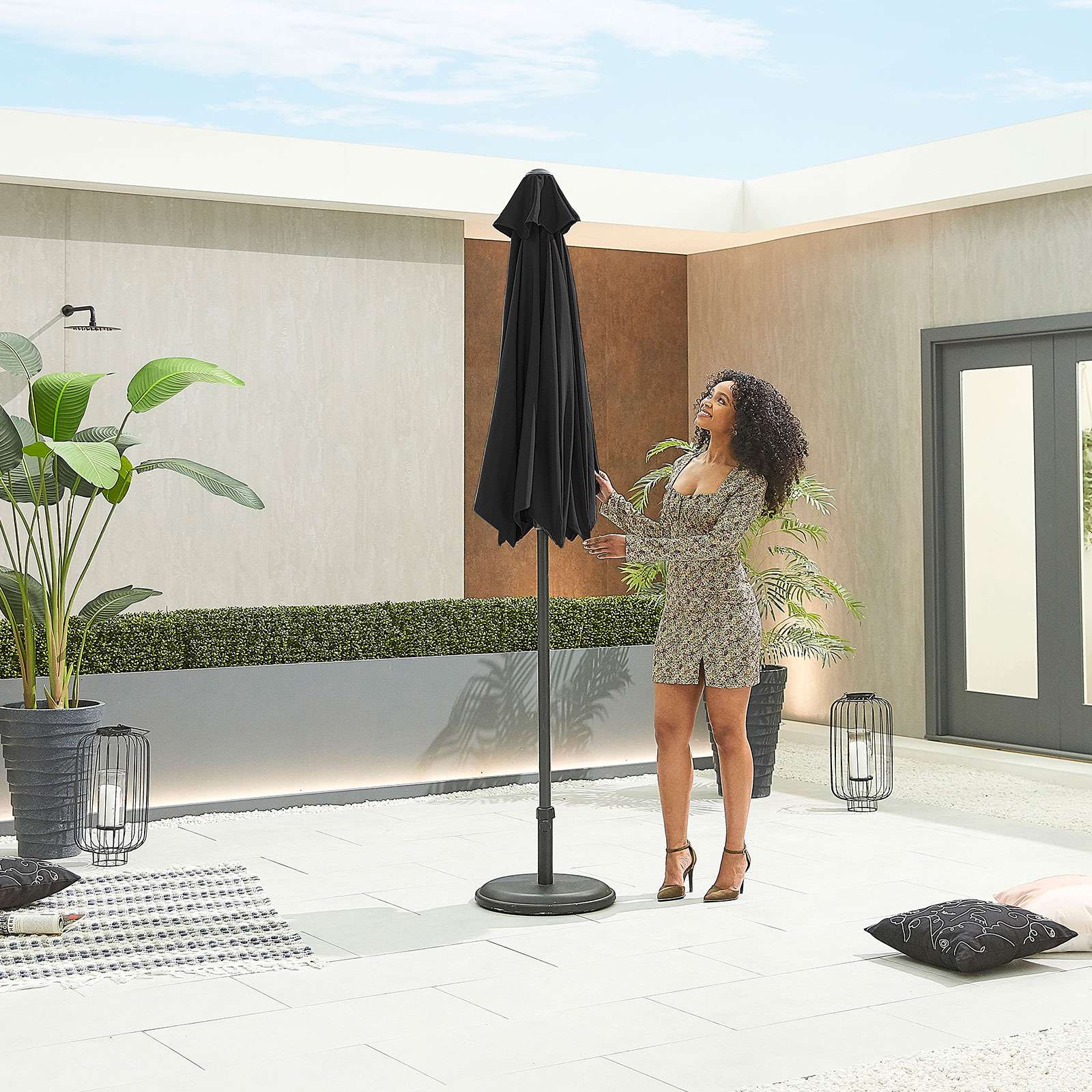 The 2.4m Round Aluminium Garden Parasol – Crank & Tilt – Black would fit through the parasol hole of your chosen dining table or can be used as a freestanding parasol to create a safe and shaded dining area when needed.