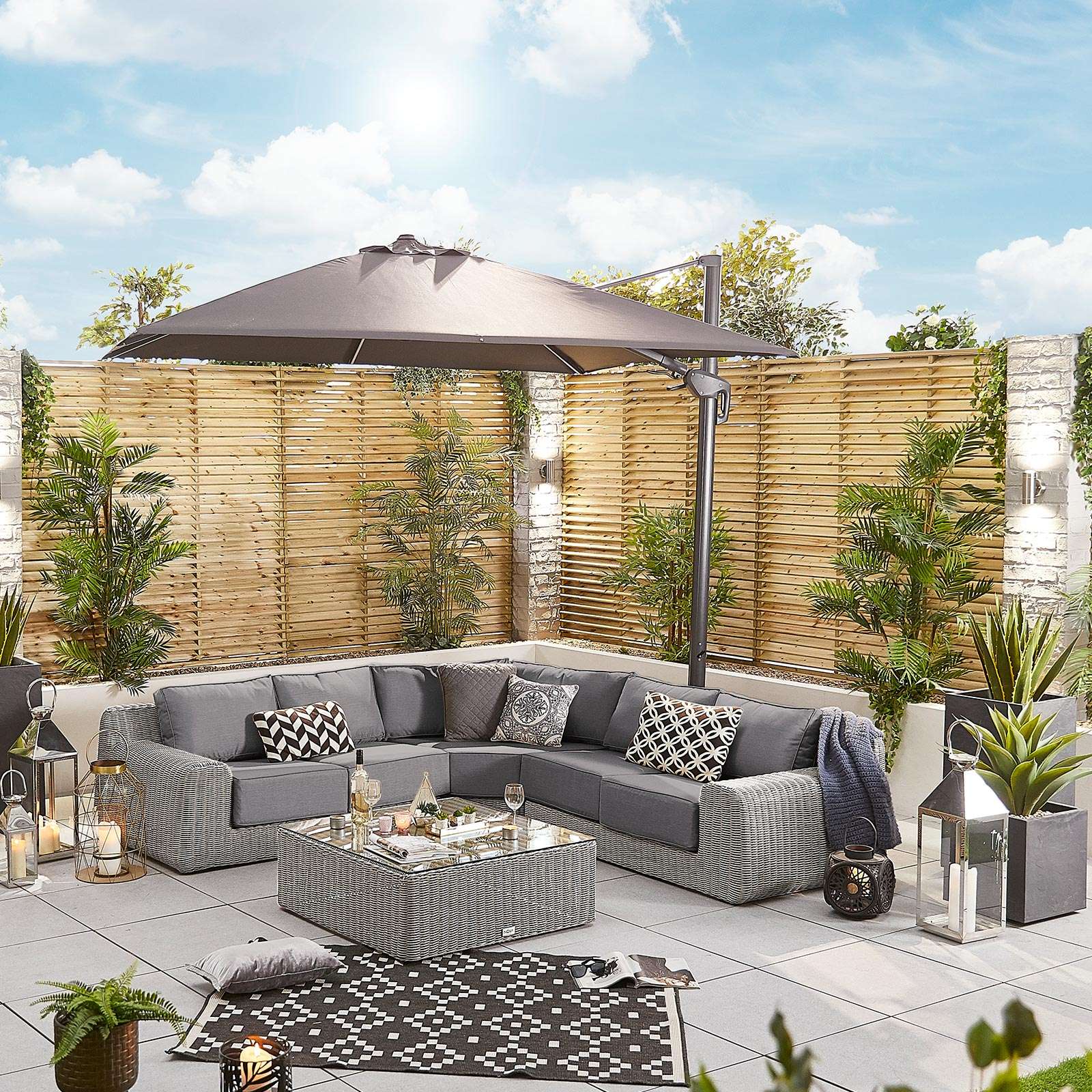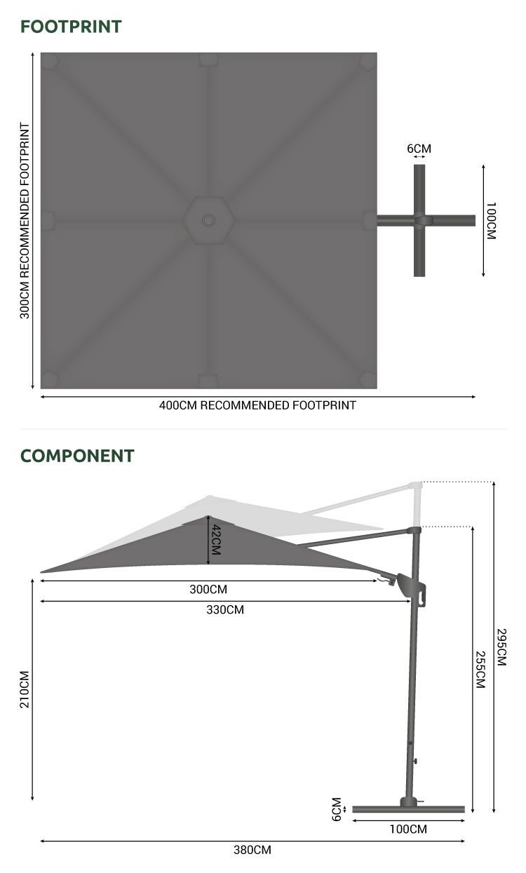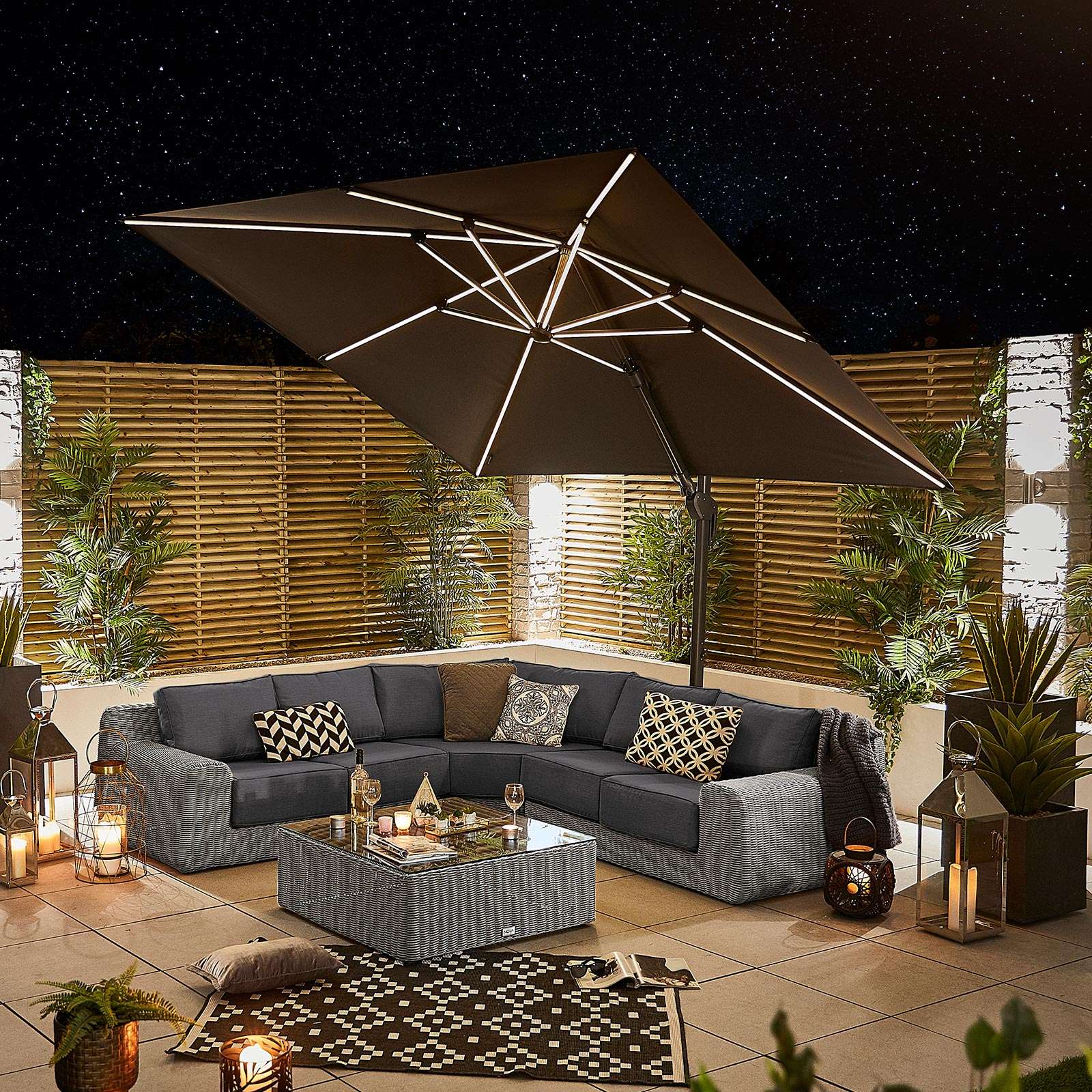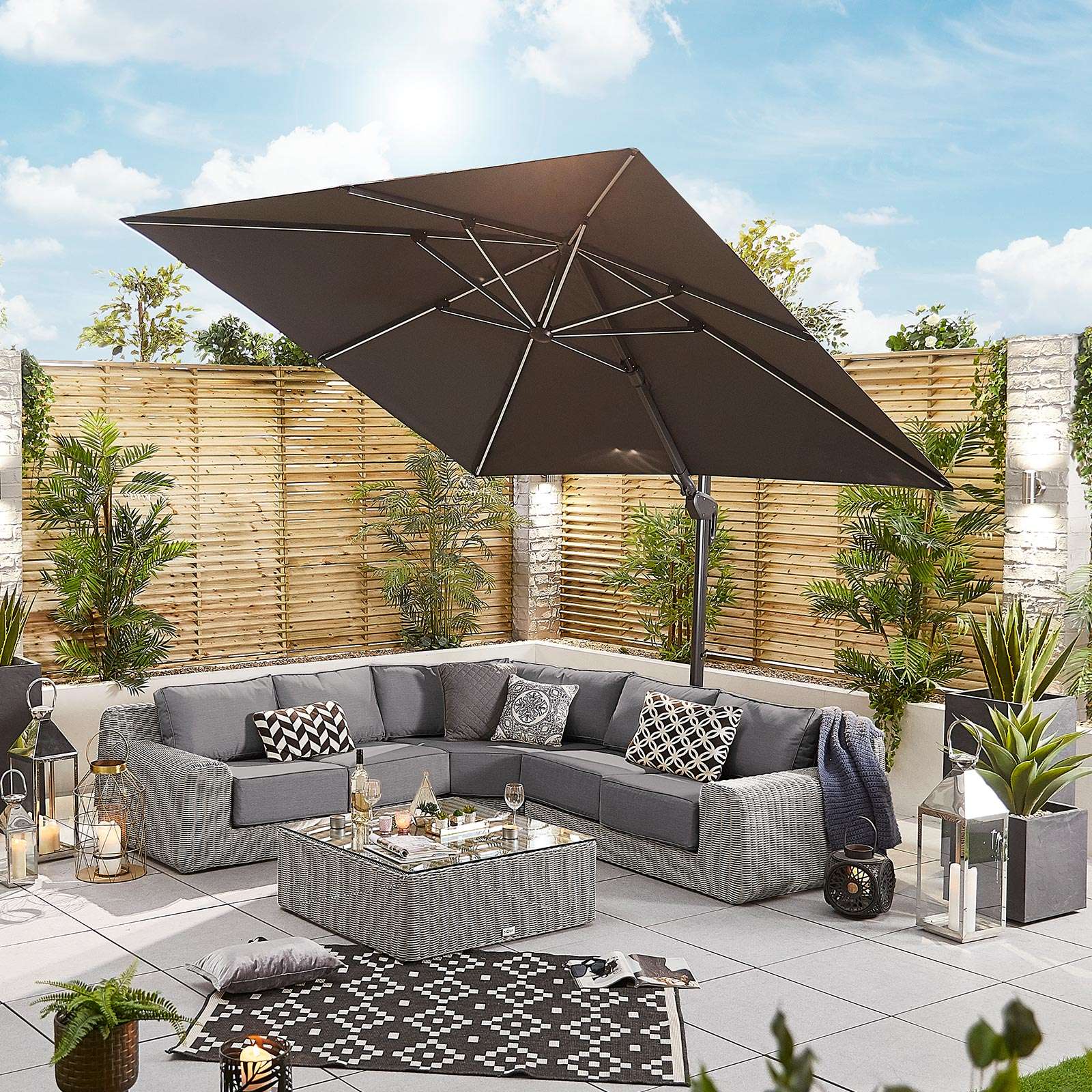 The Nova – Galaxy LED Cantilever Parasol – 3m Square – Grey is perfect for use at all times of the day thanks to the fantastic LED lights which run along the parasol ribs, allowing you to light up your outdoor space and spend more time outdoors. The LED lights are battery operated and come with a rechargable USB. This parasol is erected via a crank handle and quick release pin to secure into place. This also allows for mutliple tilting angles and can also be rotated 360? so you can protect yourself and your family from the sun, no matter what position it is in the sky. The 250g polyester parasol canopy offers plenty of sun protection as it has a UV rating of 50+. Additionally, it has a fade resistance level of 6 which means the colour is protected from fading or discolouration. Plus, it is specially treated with a PA waterproof coating, meaning you can leave it outside in all weathers. The parasol can be fully closed and we do recommend it is kept closed in windy conditions. Plus, this cantilever parasol will require a weighted base or slabs in order to keep it stood securely over your furniture. Set Includes: 1 x Cantilever Parasol 1 x USB Charger Product Features: LED Lights Battery Operated Crank Handle 360? Rotate Multiple Tilt Angles Fade Resistance Level 6 UV Rating 50+ 250g Polyester Canopy Requires Weighted Base