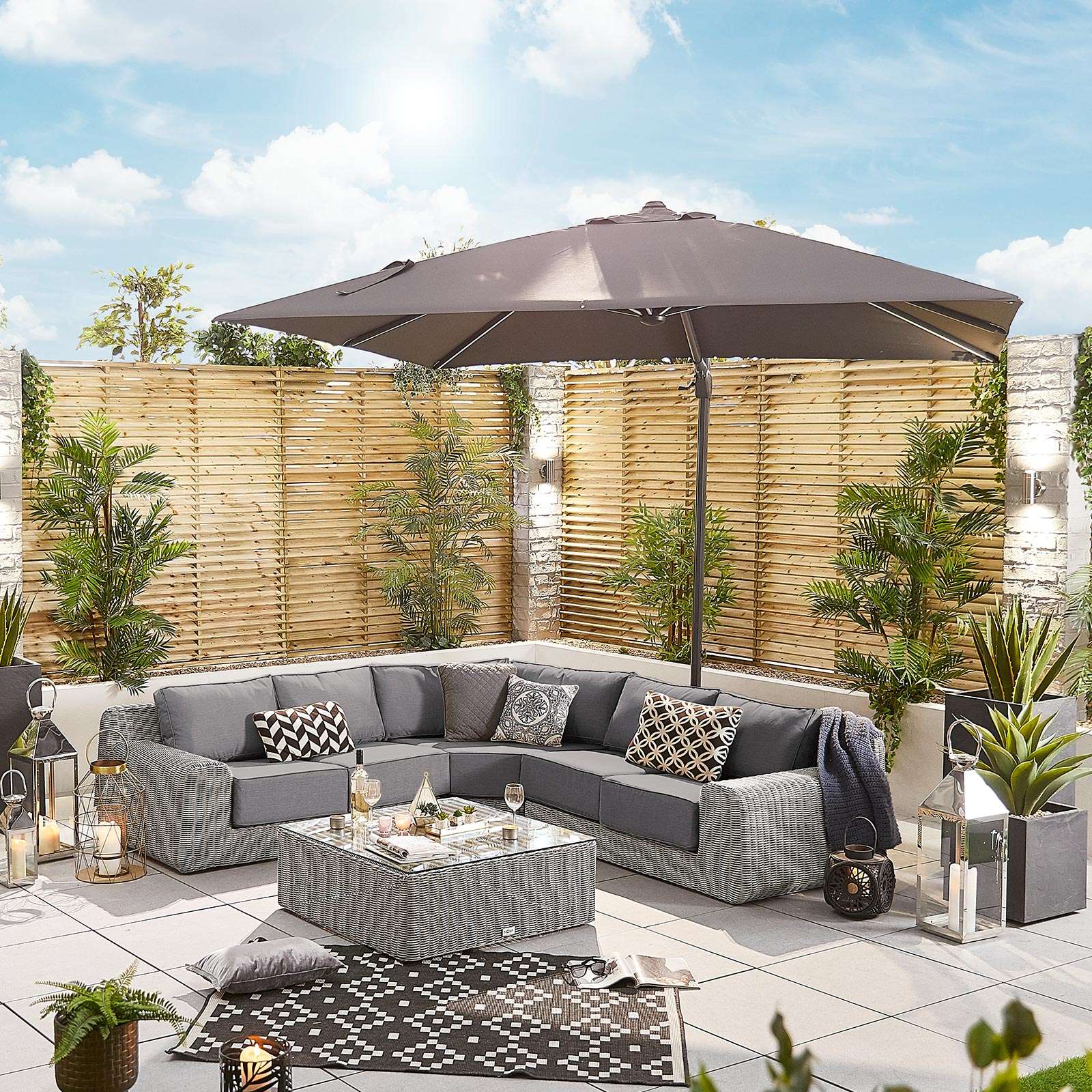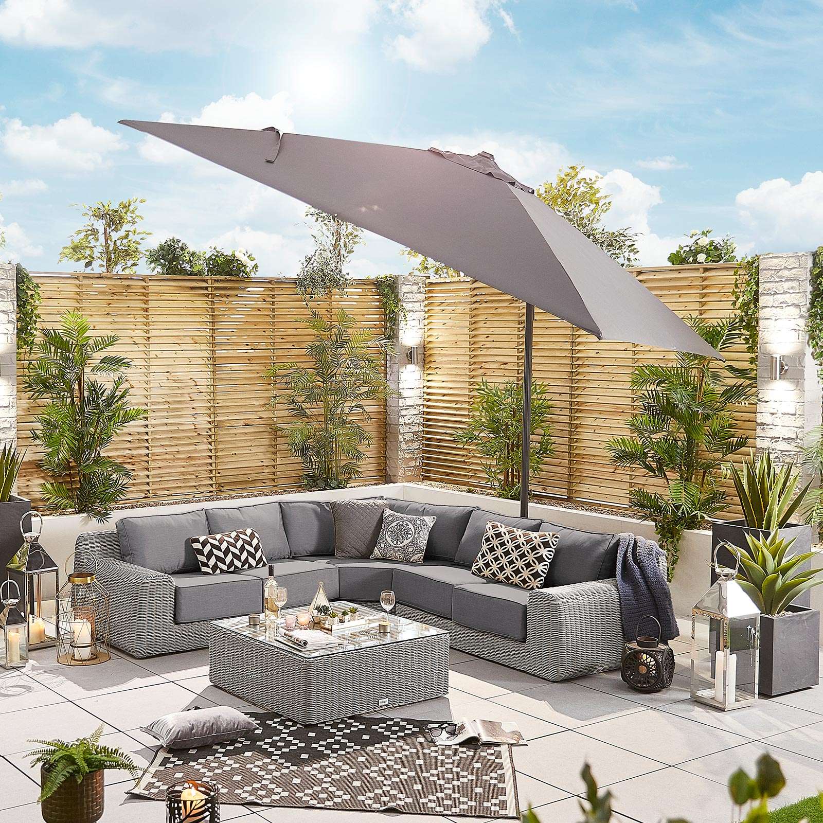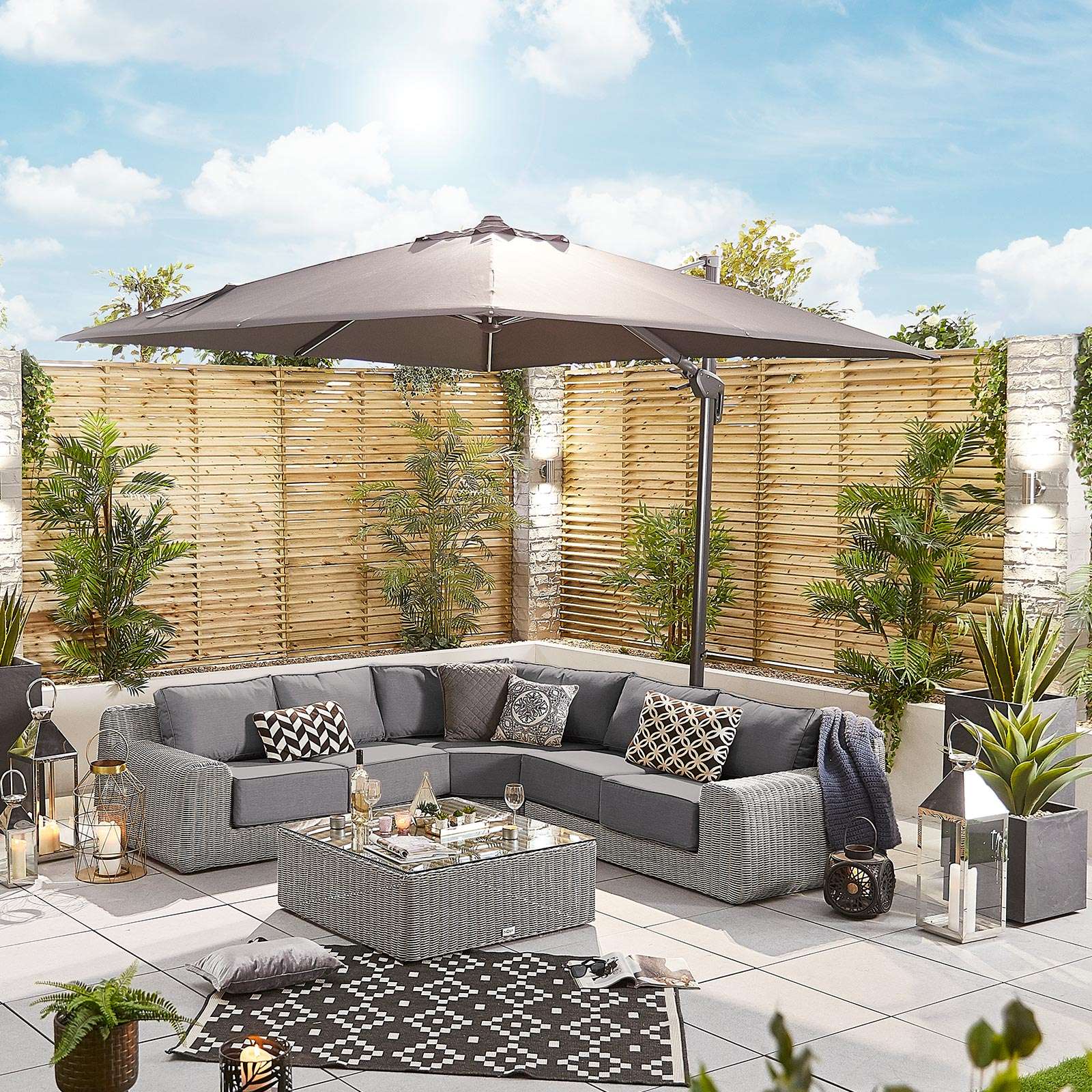 The Nova – Galaxy LED Cantilever Parasol – 3m Square – Grey is perfect for use at all times of the day thanks to the fantastic LED lights which run along the parasol ribs, allowing you to light up your outdoor space and spend more time outdoors. The LED lights are battery operated and come with a rechargable USB. This parasol is erected via a crank handle and quick release pin to secure into place. This also allows for mutliple tilting angles and can also be rotated 360? so you can protect yourself and your family from the sun, no matter what position it is in the sky. The 250g polyester parasol canopy offers plenty of sun protection as it has a UV rating of 50+. Additionally, it has a fade resistance level of 6 which means the colour is protected from fading or discolouration. Plus, it is specially treated with a PA waterproof coating, meaning you can leave it outside in all weathers. The parasol can be fully closed and we do recommend it is kept closed in windy conditions. Plus, this cantilever parasol will require a weighted base or slabs in order to keep it stood securely over your furniture. Set Includes: 1 x Cantilever Parasol 1 x USB Charger Product Features: LED Lights Battery Operated Crank Handle 360? Rotate Multiple Tilt Angles Fade Resistance Level 6 UV Rating 50+ 250g Polyester Canopy Requires Weighted Base