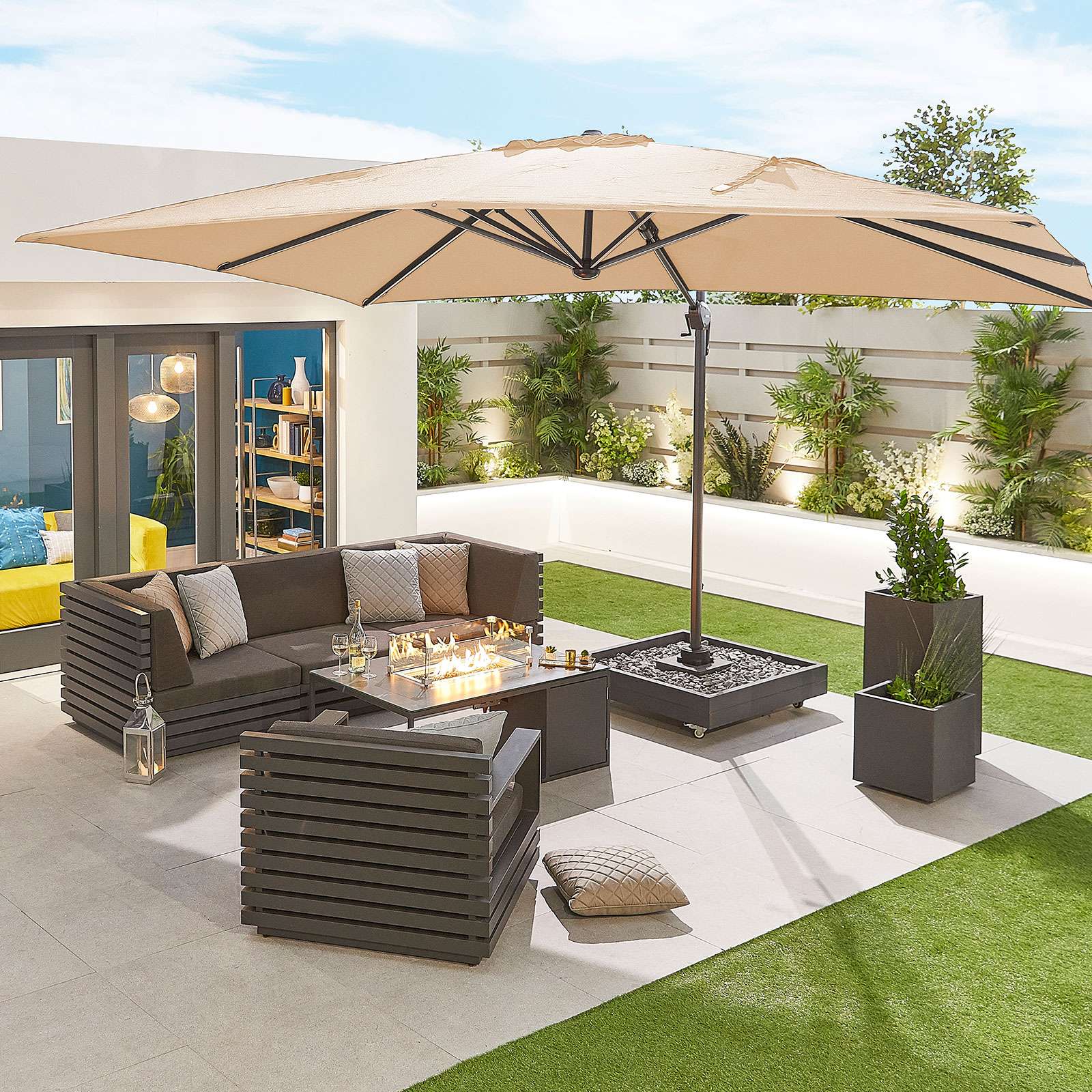 The Nova – Galaxy LED Cantilever Parasol – 4m x 3m Rec – Beige is perfect for use at all times of the day thanks to the fantastic LED lights which run along the parasol ribs, allowing you to light up your outdoor space and spend more time outdoors. The LED lights are battery operated and come with a rechargable USB. This parasol is erected via a crank handle and quick release pin to secure into place. This also allows for mutliple tilting angles and can also be rotated 360? so you can protect yourself and your family from the sun, no matter what position it is in the sky. The 250g polyester parasol canopy offers plenty of sun protection as it has a UV rating of 50+. Additionally, it has a fade resistance level of 6 which means the colour is protected from fading or discolouration. Plus, it is specially treated with a PA waterproof coating, meaning you can leave it outside in all weathers. The parasol can be fully closed and we do recommend it is kept closed in windy conditions. Plus, this cantilever parasol will require a weighted base or slabs in order to keep it stood securely over your furniture. Set Includes: 1 x Cantilever Parasol 1 x USB Charger Product Features: LED Lights Battery Operated Crank Handle 360? Rotate Multiple Tilt Angles Fade Resistance Level 6 UV Rating 50+ 250g Polyester Canopy Requires Weighted Base
