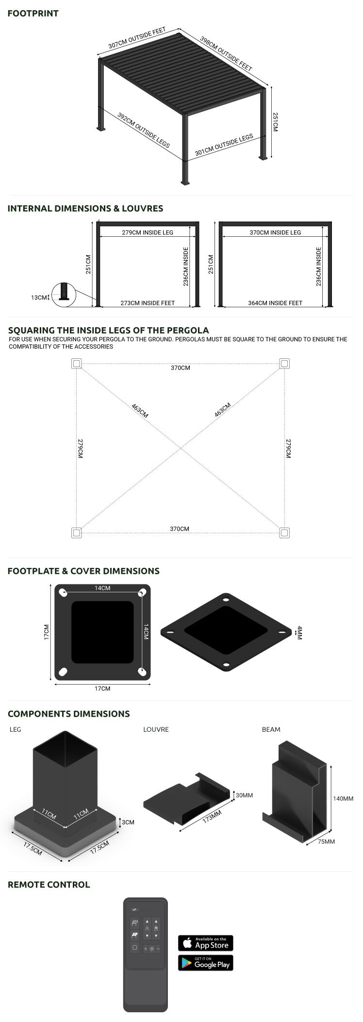 Please note, this pergola will need to be plugged into mains electricity in order to run the louvres and the LED lights. A 5m lead cable is included, giving you plenty of room to reach your nearest plug socket. These should be plugged into an indoor socket or suitably covered outdoor socket.