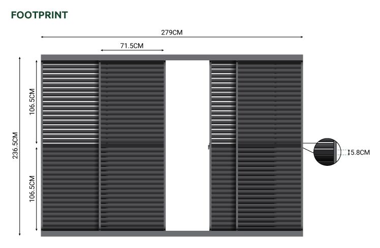This accessory has been exclusively designed to fit the NOVA Titan, Titan Plus and Proteus Pergola* ranges. For models purchased prior to 2022, the crank handle positioning will obstruct fixing walls to the underneath and should be taken into consideration when designing accessory composition. For all free-standing pergolas ordered in 2022 and onwards, accessories can be fitted to all sides. As wall-mounted pergolas are angled away from the supporting wall, accessories can only be installed to the front side of the pergola. Drilling into the pergola structure will be required when fitting any accessories and so installation assistance may be necessary. *This accessory will not fit the Proteus Lite model.