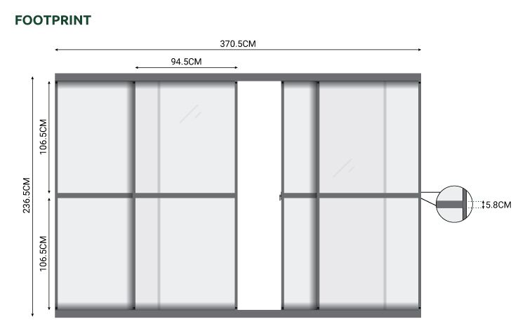 The sliding door comes in 4 sections, two inner doors and two outer doors. The outer doors stay fixed to the legs of the pergola, whereas the inner doors slide open and closed. Each section is split into a top and bottom half, seperated by an aluminium bar to match your pergola framework. Both halves have Polycarbonate windows fitted for style and safety, offering more protection from wind by creating an enclosed sheltered space. Allow sunlight to come flooding in by parting the two inner doors. Should that unexpected raincloud come overhead, simply meet the two inner doors together again and secure with the locking mechanism.