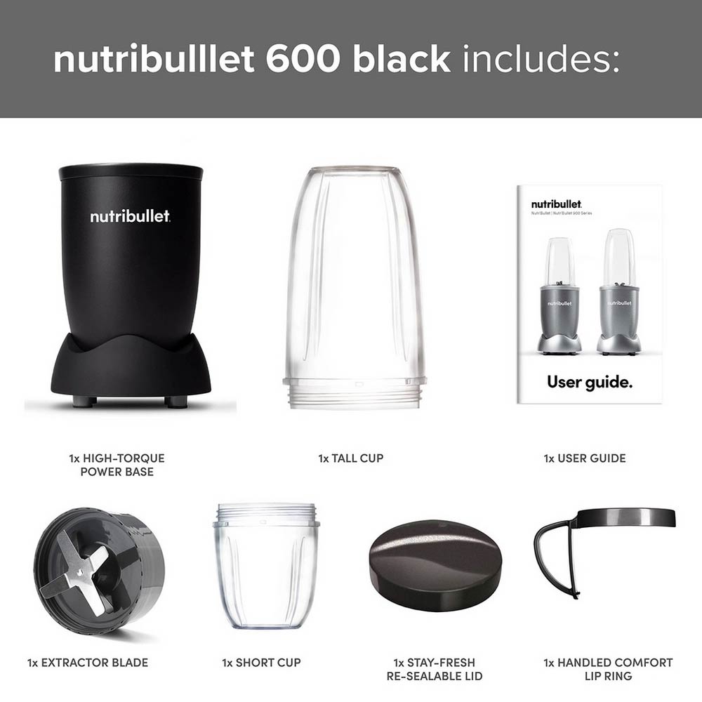 The complete Nutribullet 600 Series kit comes with the High Torque Power Base, Extractor Blade, Tall Cup, Short Cup, Handled Comfort Lip Ring, Stay-Fresh Lid and the User Manual with Recipes.