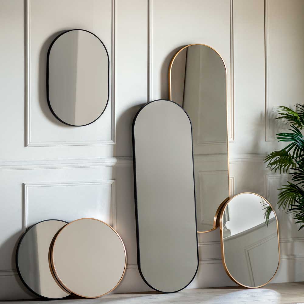 With friendly rounded shapes this mirror set in a simple gold frame adds some clean modern lines to your wall. Available is 3 sizes