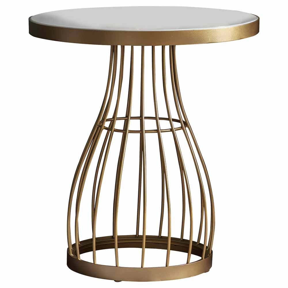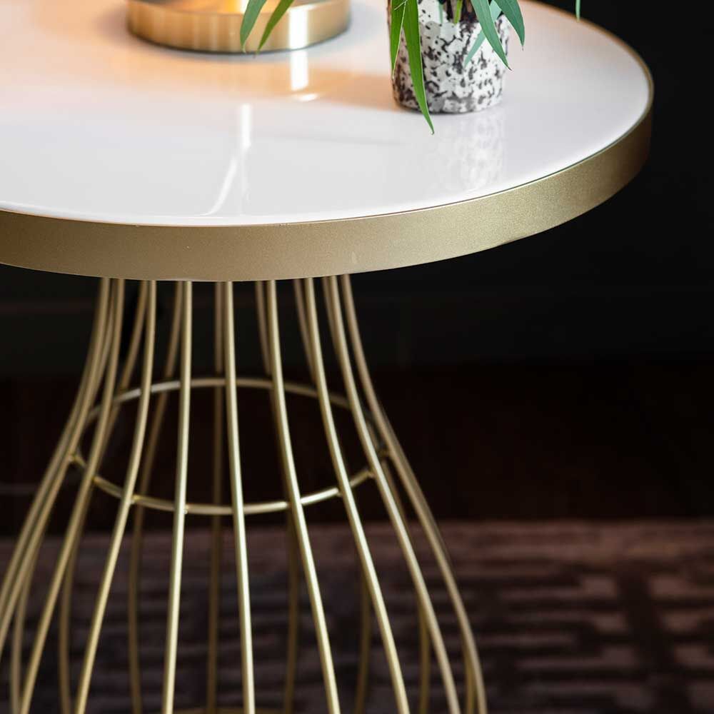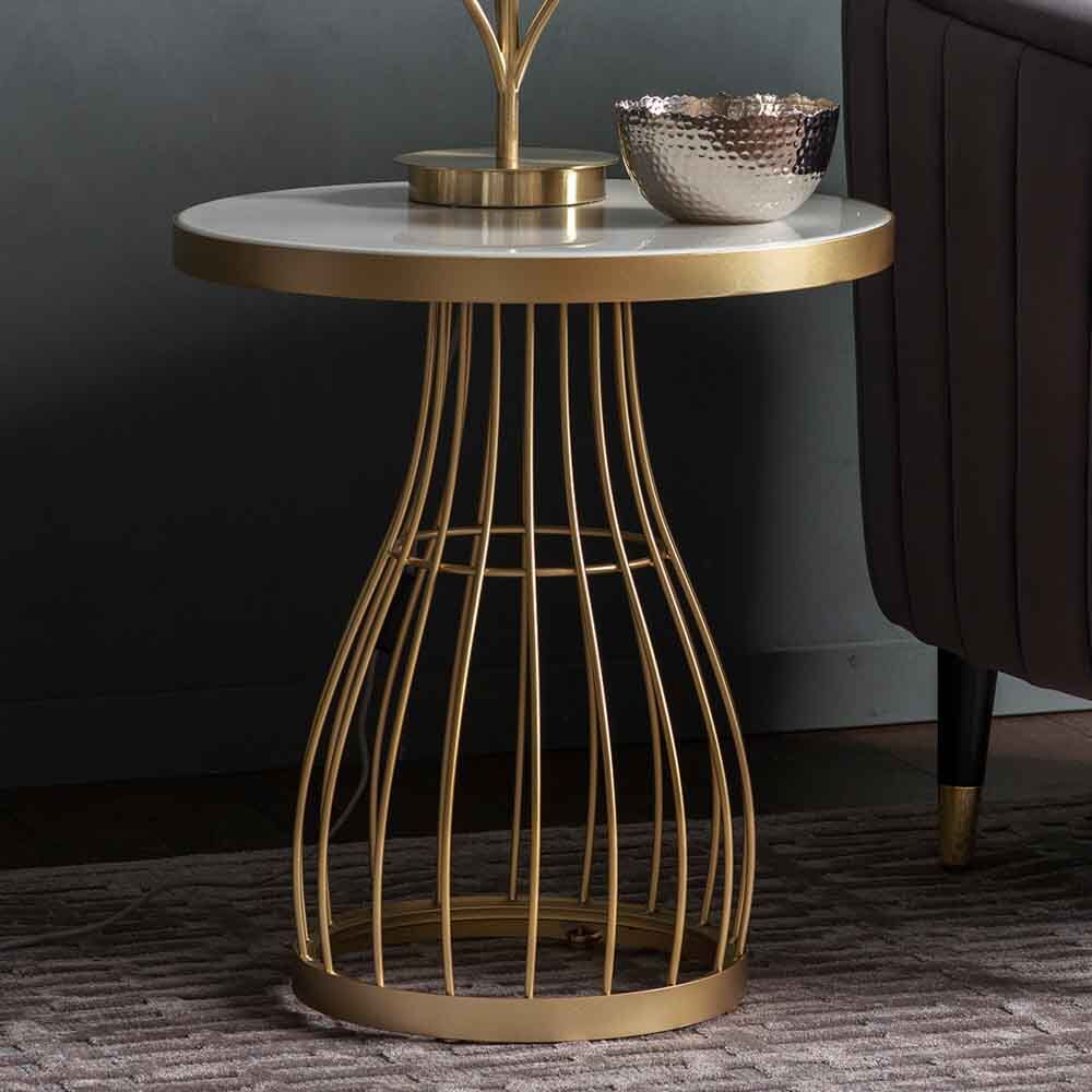 This decorative side table has a champagne powder coated caged frame with a inlaid tinted glass top