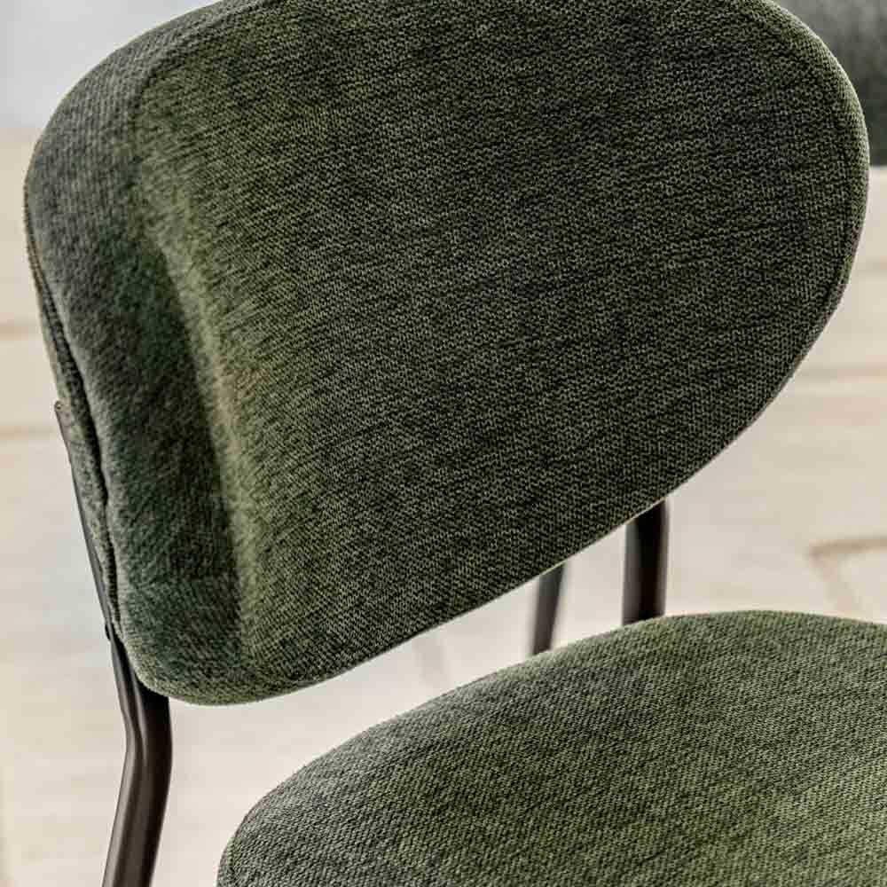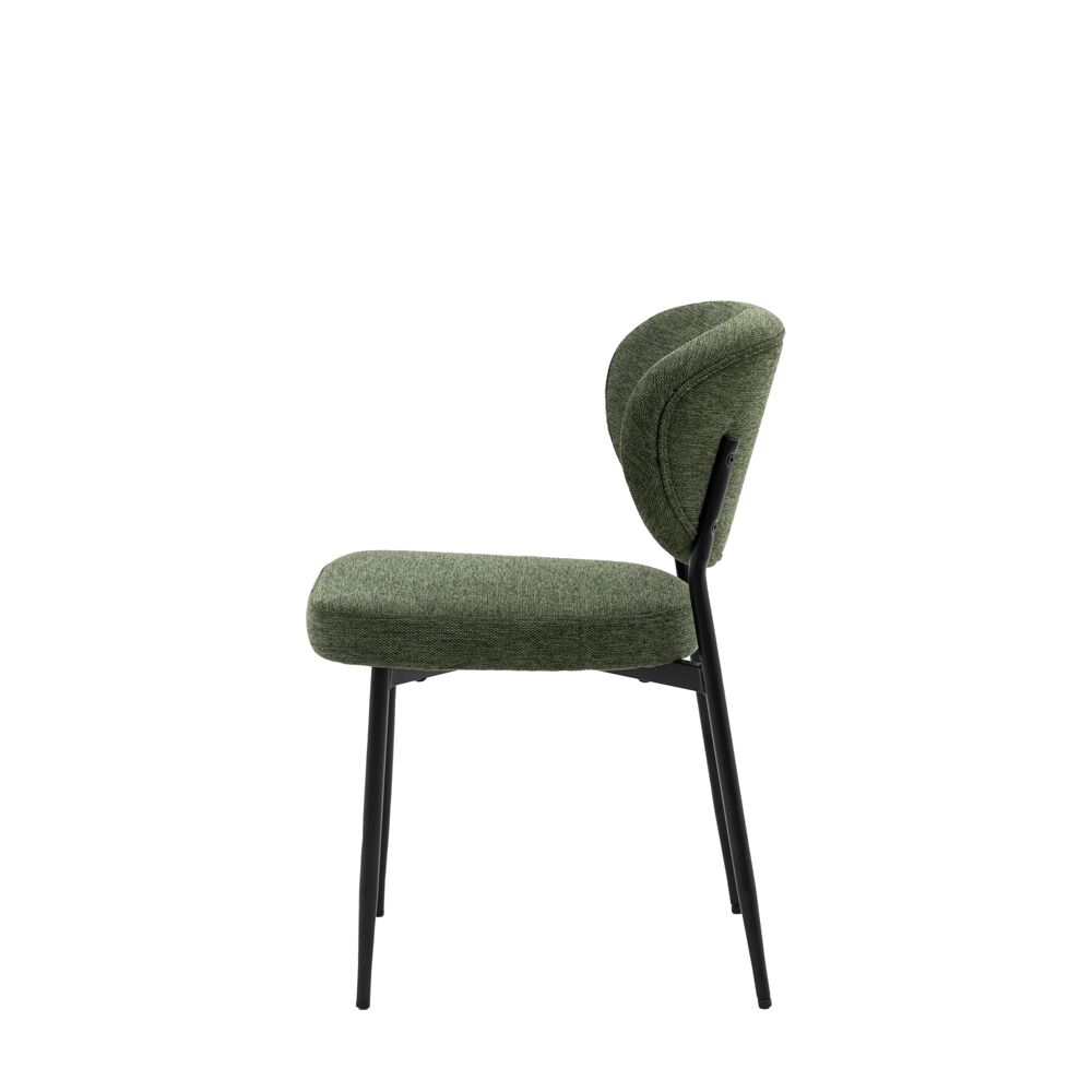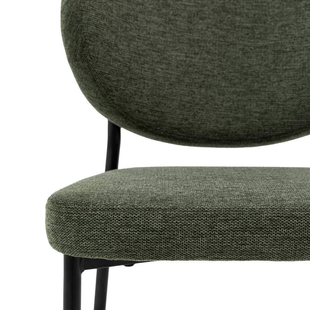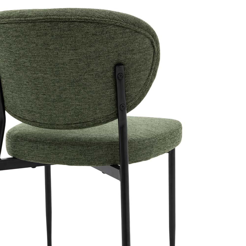 This dining chair is a stylish and comfortable addition to any dining space. Its unique oval-shaped backrest and sleek black metal legs create a modern and eye-catching look. The soft, upholstered seat provides comfort and style, while the green fabric adds a touch of sophistication.