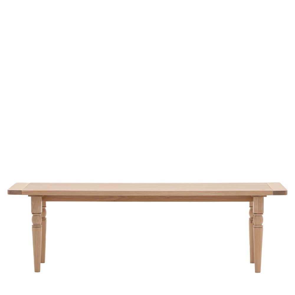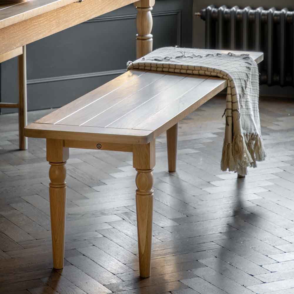 Add a bit of country charm to your dining area. With a classic country farmhouse feel, this dining bench features a solid oak underframe, grooved seat and turned spindle style legs. Add a little extra comfort with cushions or seat pads.