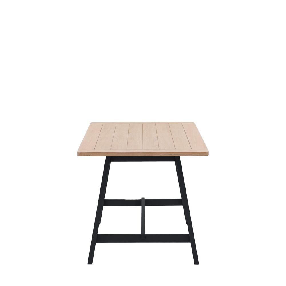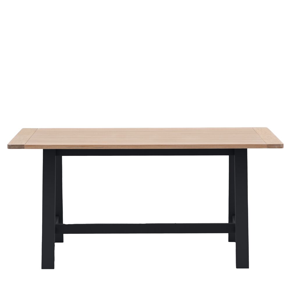 A modern take on a country style dining table, this rectangular trestle table features a grooved & planked oak top with the angular hand painted solid timber legs. Pairs perfectly with the coordinating bench or dining chairs.