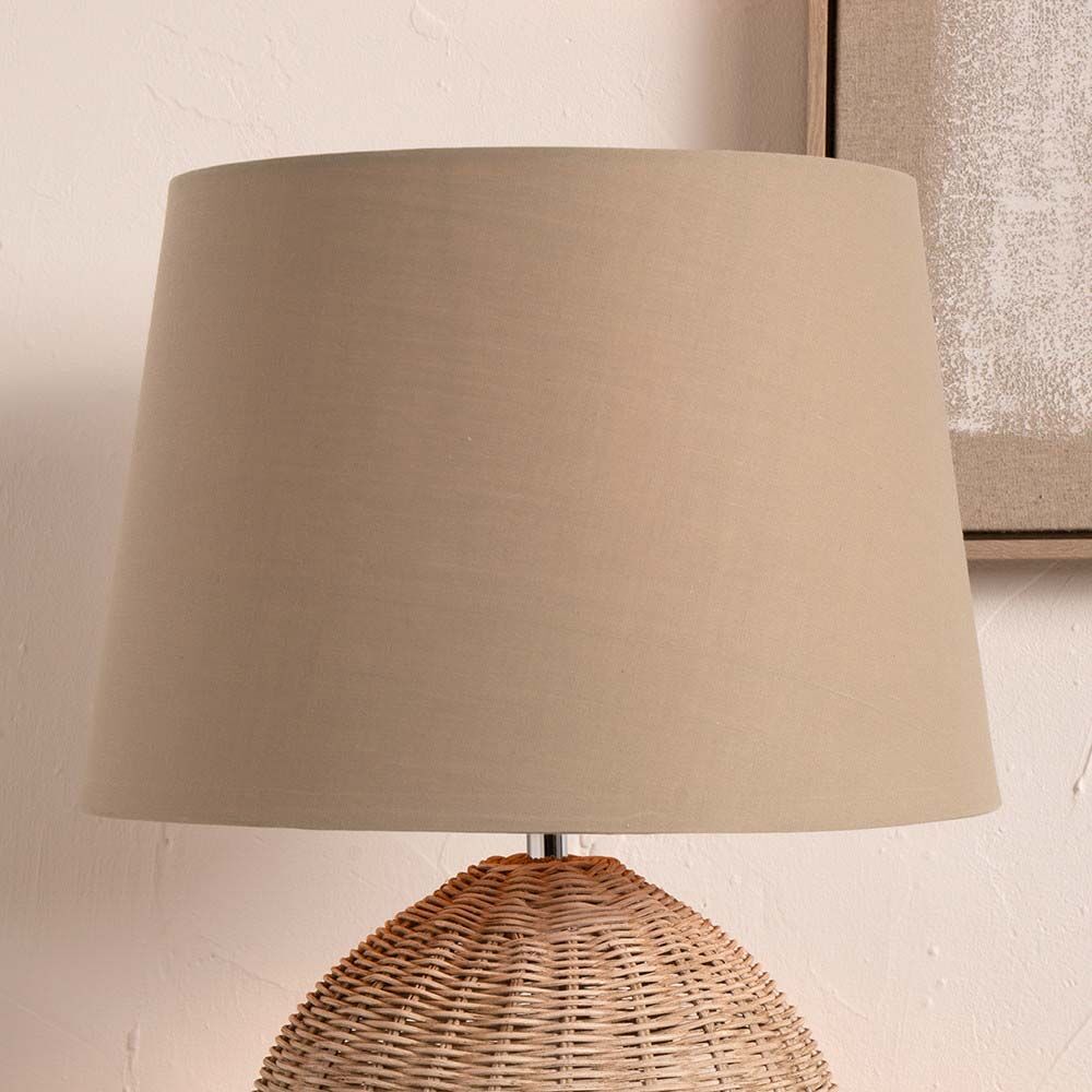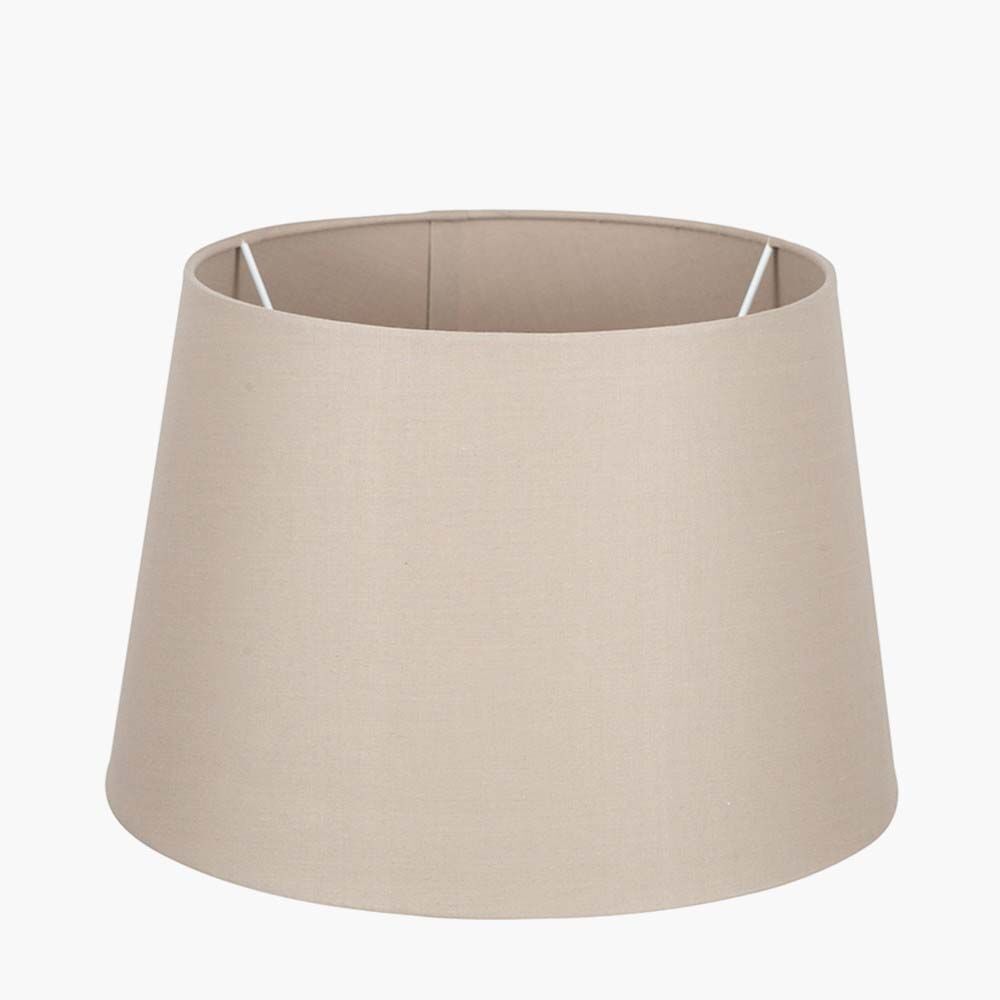 Simple modern 35cm taupe tapered self lined cylinder poly cotton shade which sits beautifully with a variety of bases