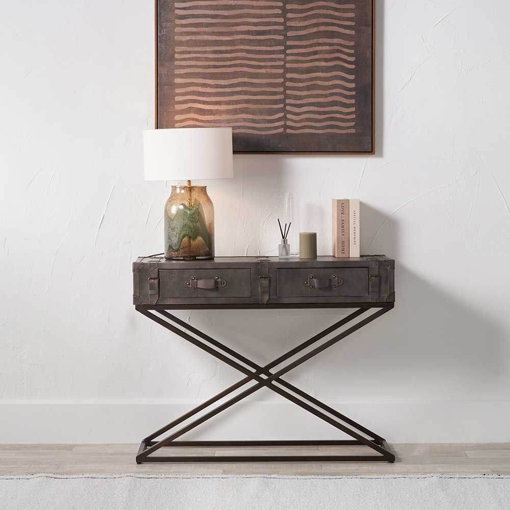 Add a touch of understated elegance with this peppercorn leather console table. Handmade in India and wrapped in leather with a rich, smoky finish, it features clean lines and subtle stitching for a refined look. The two storage drawers keep clutter out of sight, making it a perfect blend of style and function for any modern space.