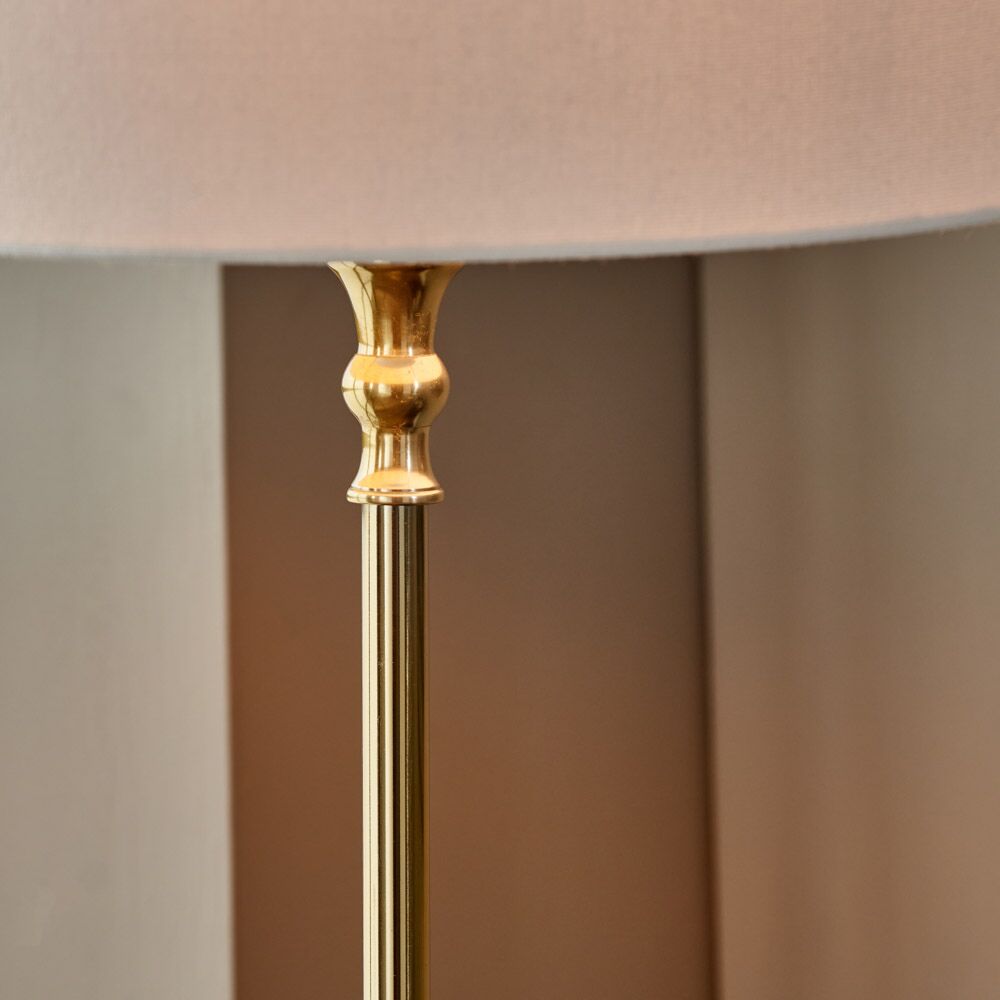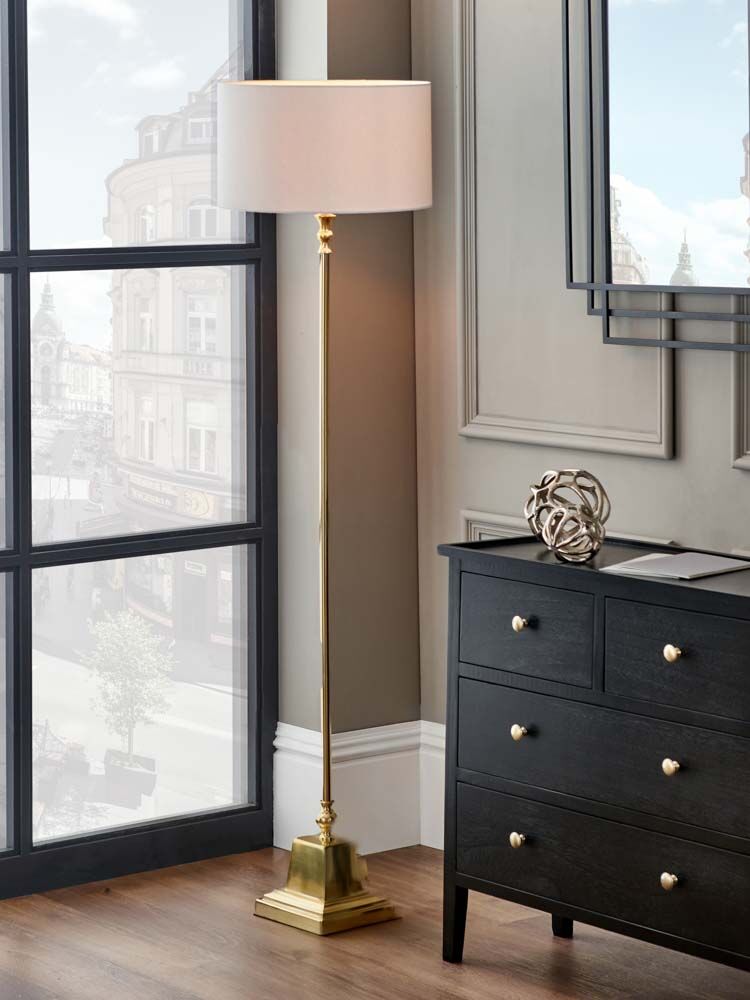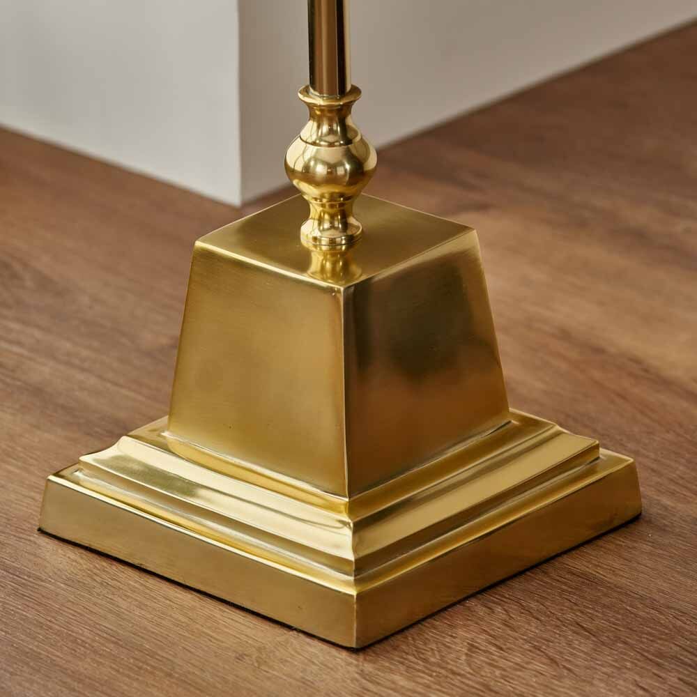 This beautifully simple yet elegant candlestick floor lamp base with a classical square foot is finished in sophisticated shiny gold metal. This base would look perfect in your living room or dining room to create ambient lighting.
