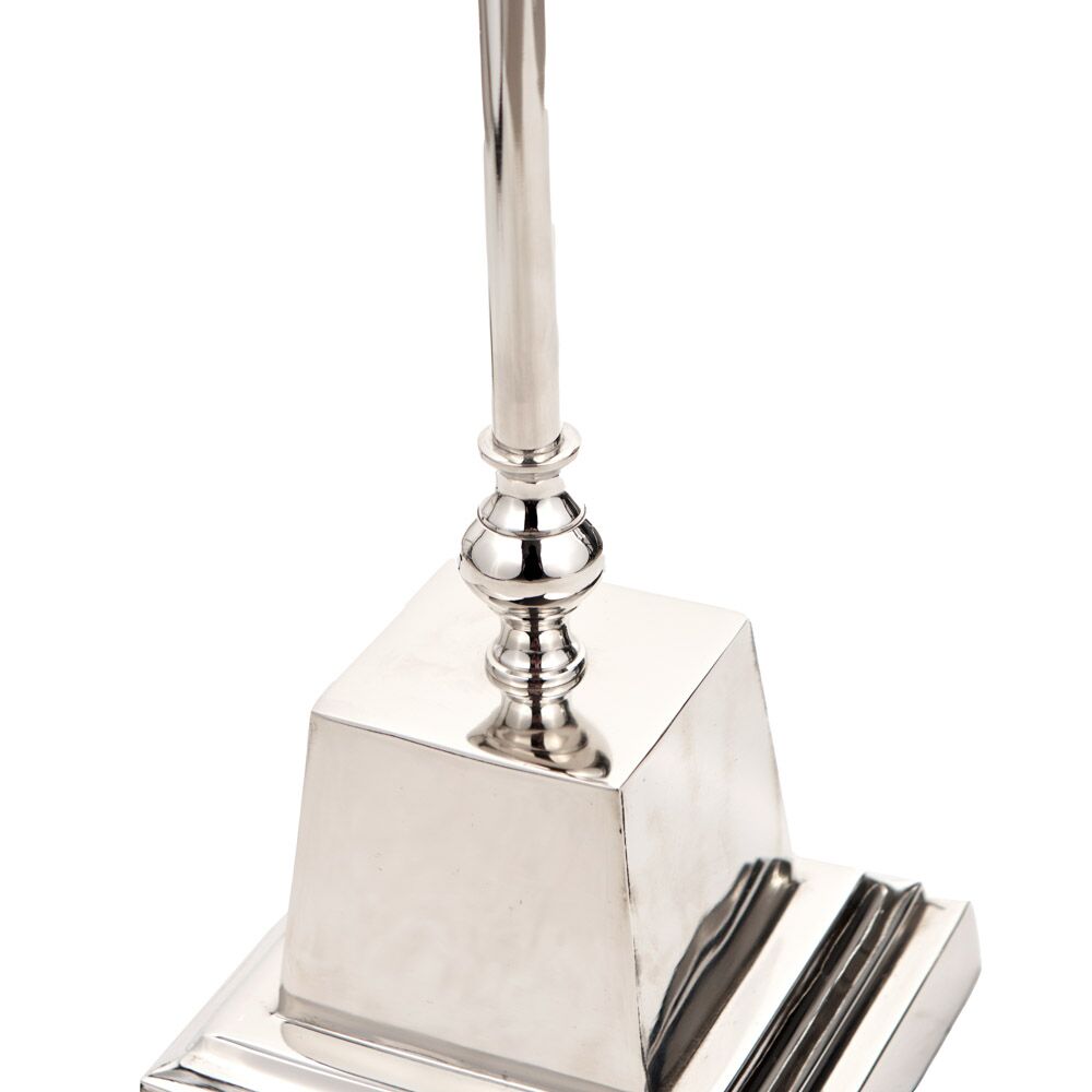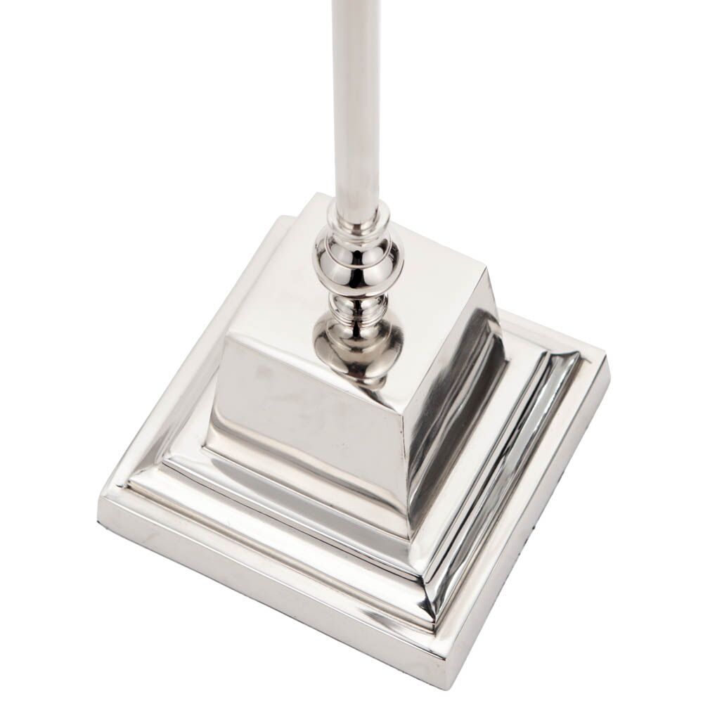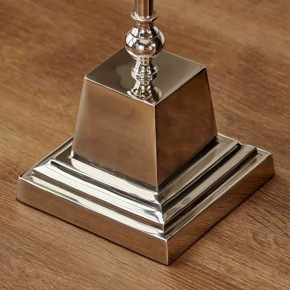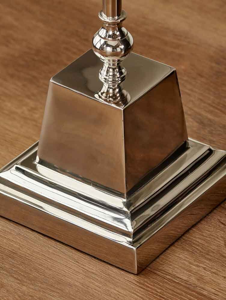 This beautifully simple yet elegant candlestick floor lamp base with a classical square foot is finished in sophisticated shiny silver metal. This base would look perfect in your living room or dining room to create ambient lighting.