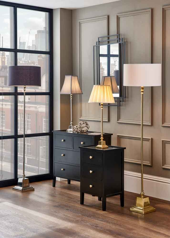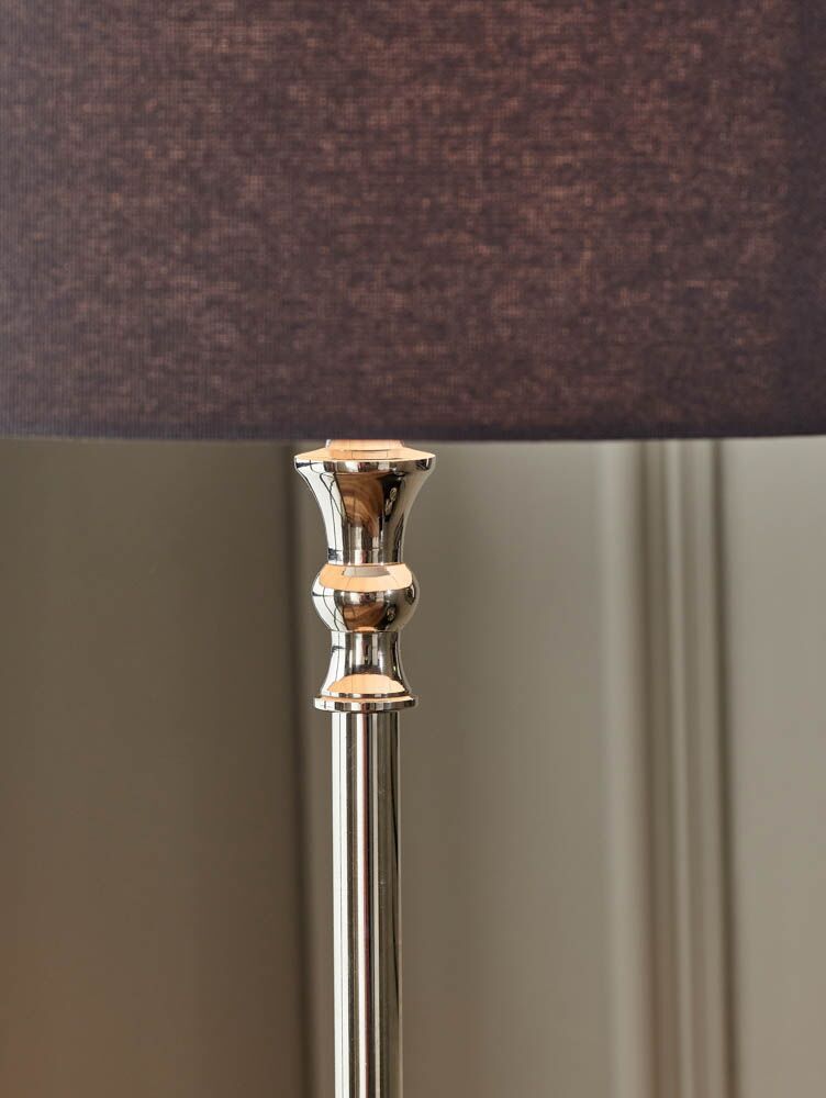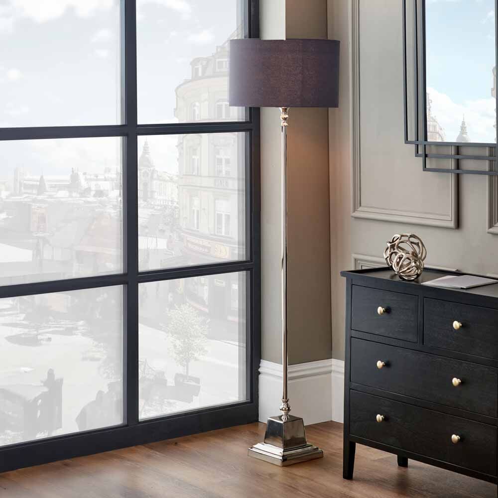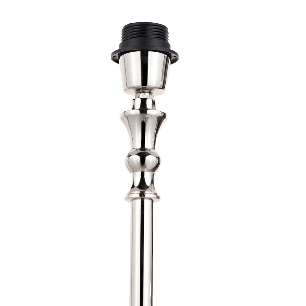 This beautifully simple yet elegant candlestick floor lamp base with a classical square foot is finished in sophisticated shiny silver metal. This base would look perfect in your living room or dining room to create ambient lighting.