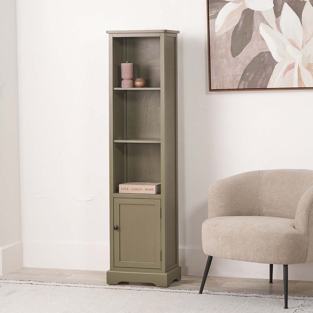 Bring warmth and character to your space with this tall, slim storage unit, finished in a rich olive lacquer. Featuring two open shelves and a single cupboard, it provides the perfect mix of display and hidden storage. Its deep, inviting tone and clean lines add a sophisticated feel to any room, while the compact design makes it ideal for smaller spaces. Organise books, d?cor, or everyday essentials with effortless style and understated charm.