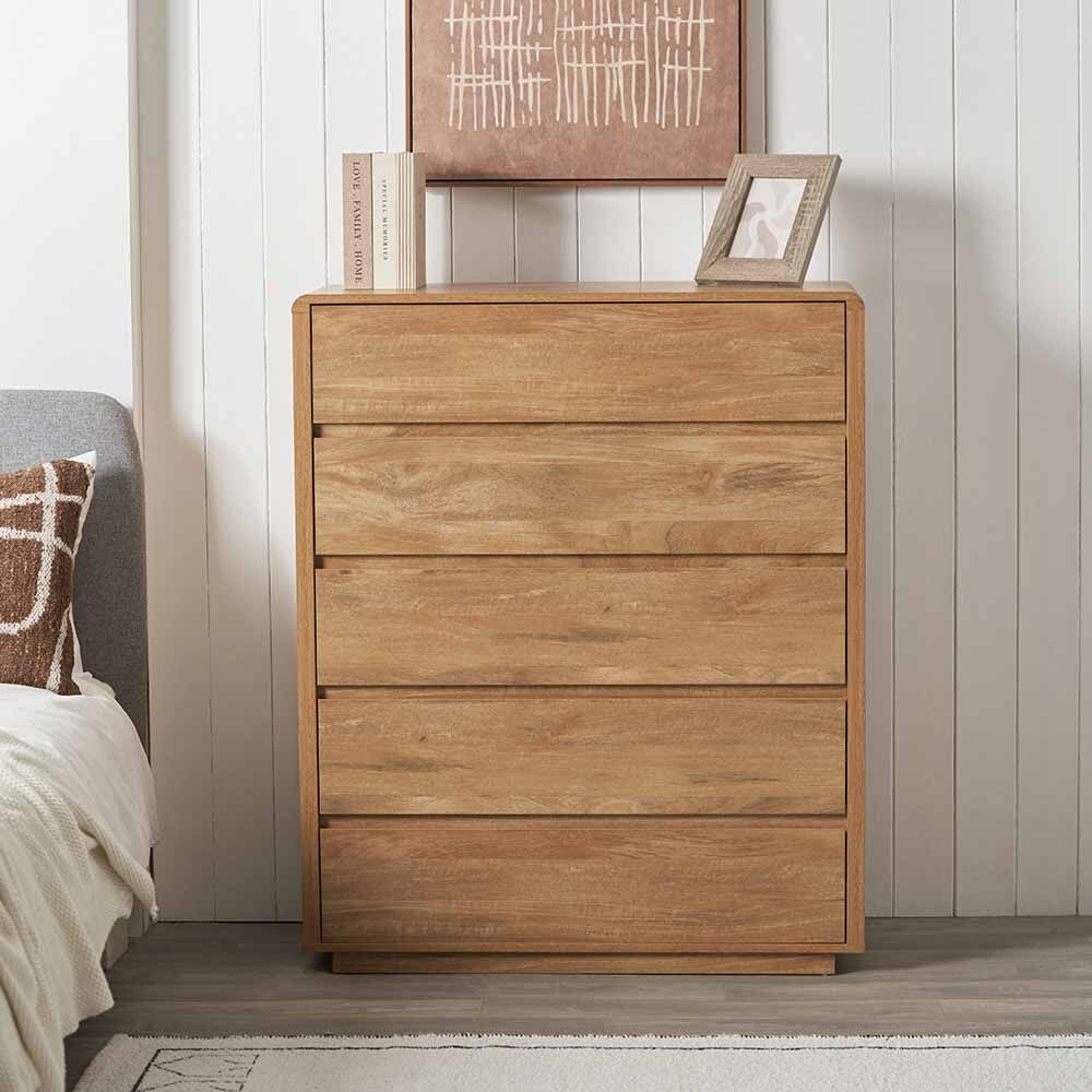 Designed to blend style with functionality, this 5 drawer unit offers generous storage while maintaining a clean, contemporary look. Crafted in a warm oak-effect veneer with a subtle wood grain texture, it reflects the timeless appeal of Scandi-inspired design. Perfect for bedrooms or living spaces alike, it brings both practicality and natural charm to your interior.