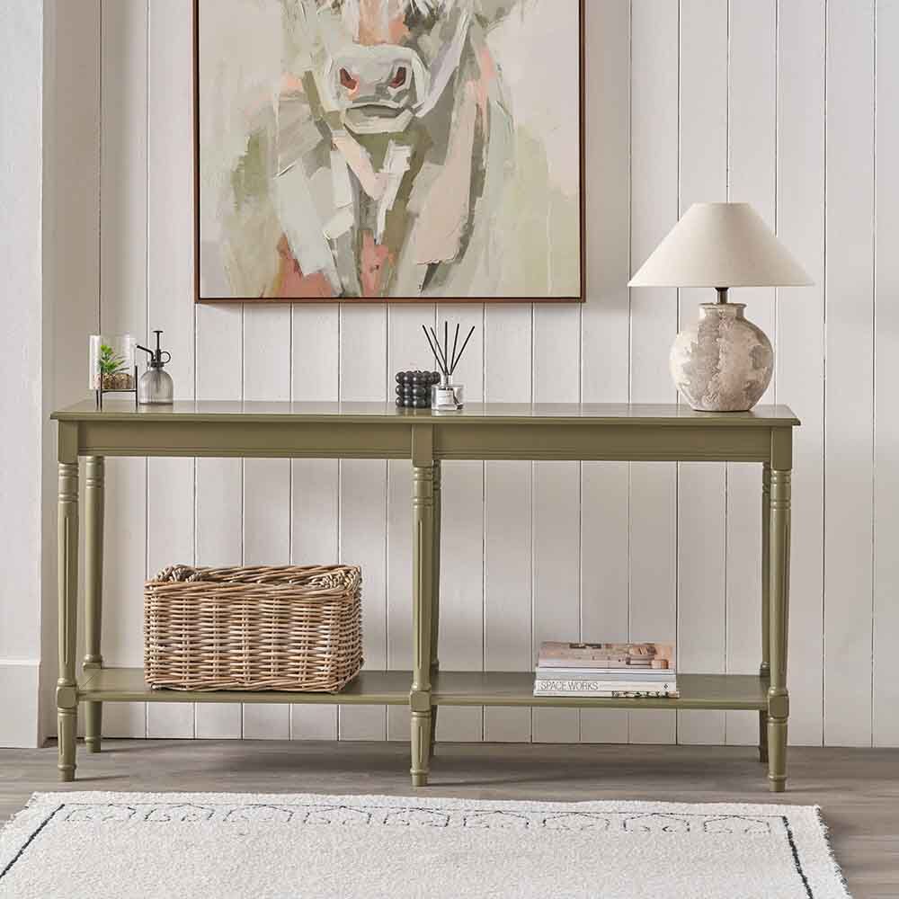 This elegant, extended rectangular pine wood console table is finished in the rich olive lacquer, combining practical storage with a spacious tabletop. Perfect for entrance hallways or indeed any living space, the deep, inviting hue brings warmth and character, adding understated sophistication without dominating the room.