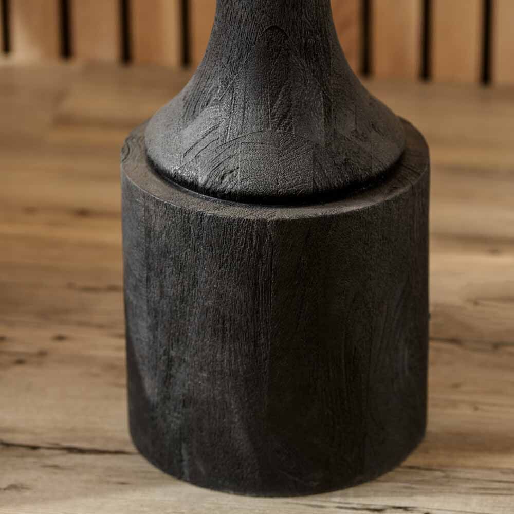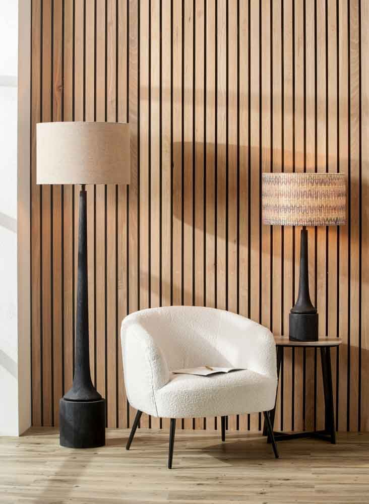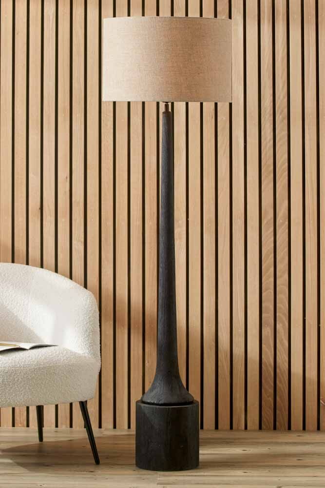 With its sleek black design and textured wooden base, this floor lamp will add a touch of sophistication to any room. The slender silhouette looks striking with either a matching black shade or conversely, a shade with a pop of colour. Both will make this lamp stand out from the crowd. Recommended lampshade size: 45cm diameter.